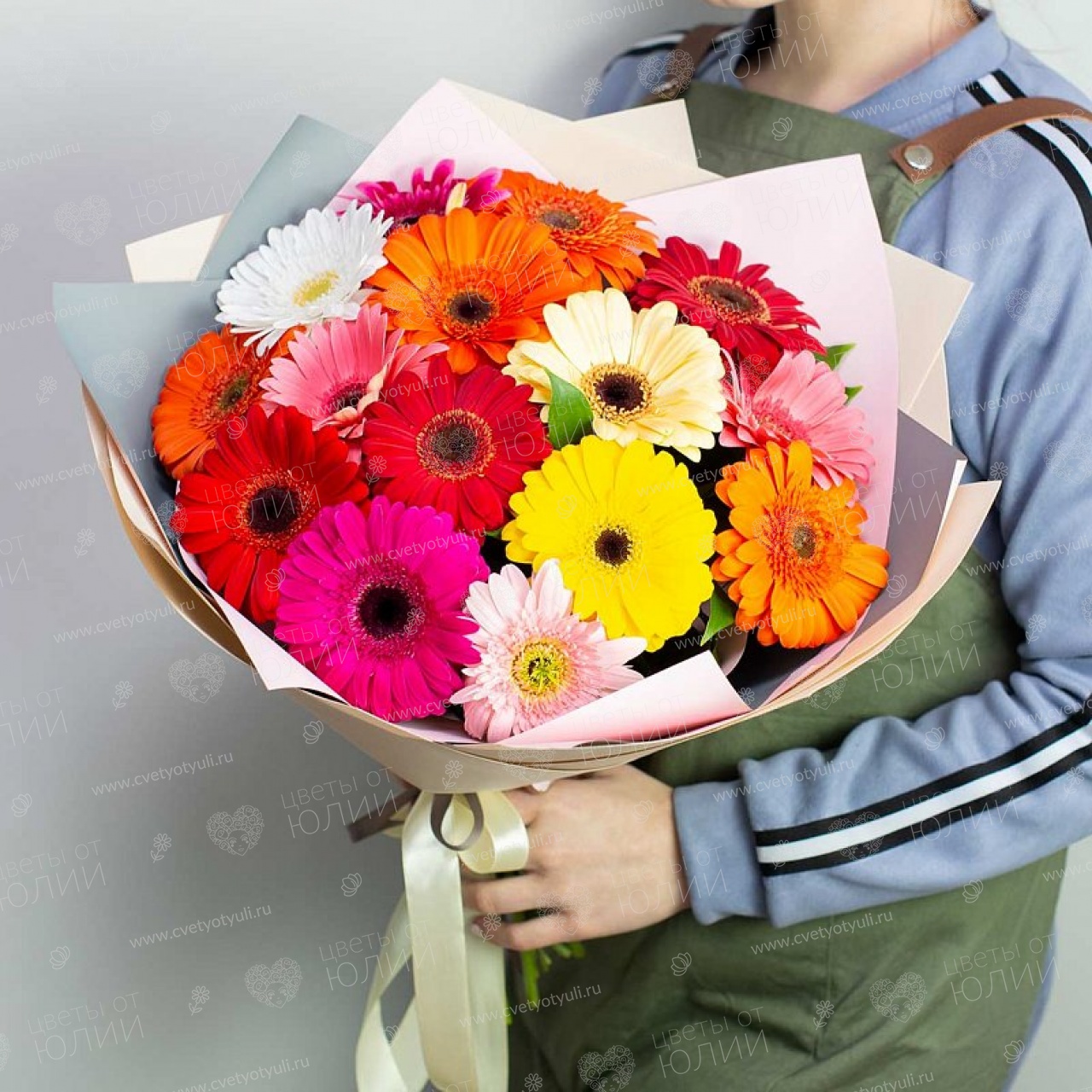 Гербера - 15 шт, русскус, упаковка, лента.