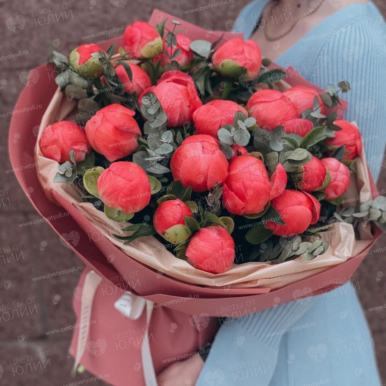 Пион - 19 шт, эвкалипт, упаковка, лента.