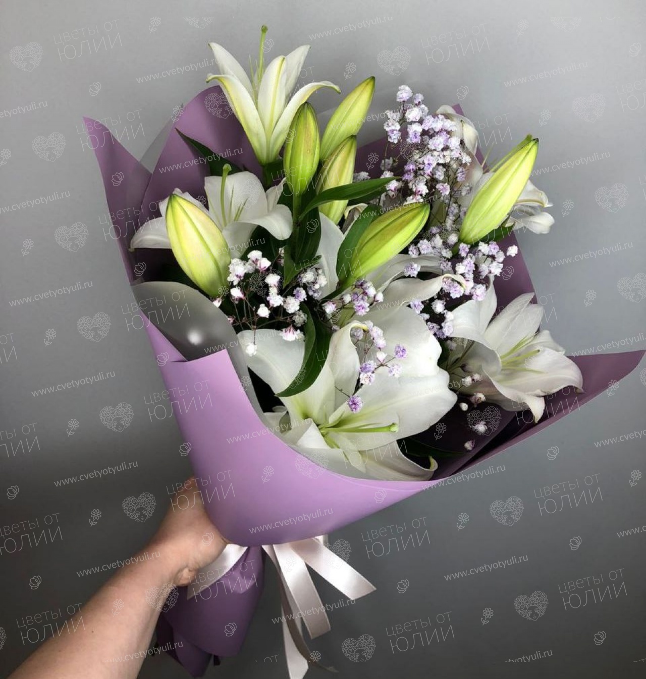 • Состав: Лилии, Гипсофила, Упаковка, Зелень