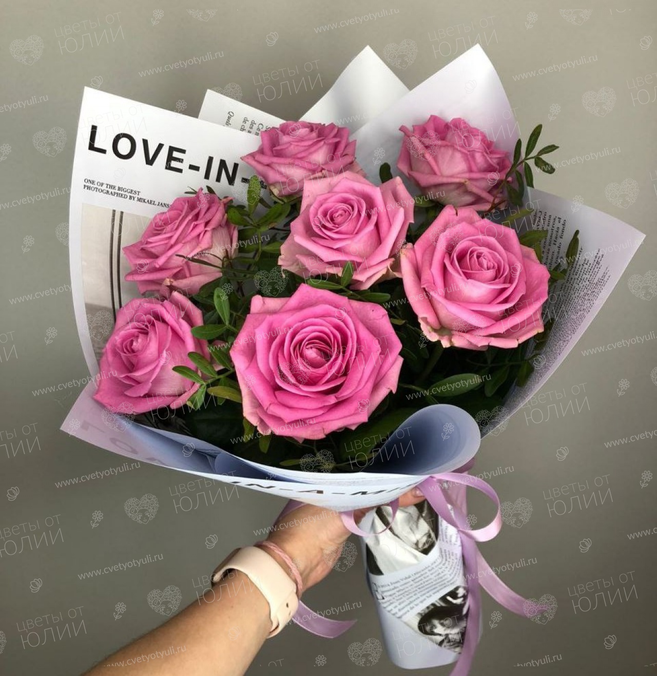 Букет из 7 розовых роз 40 см с зеленью