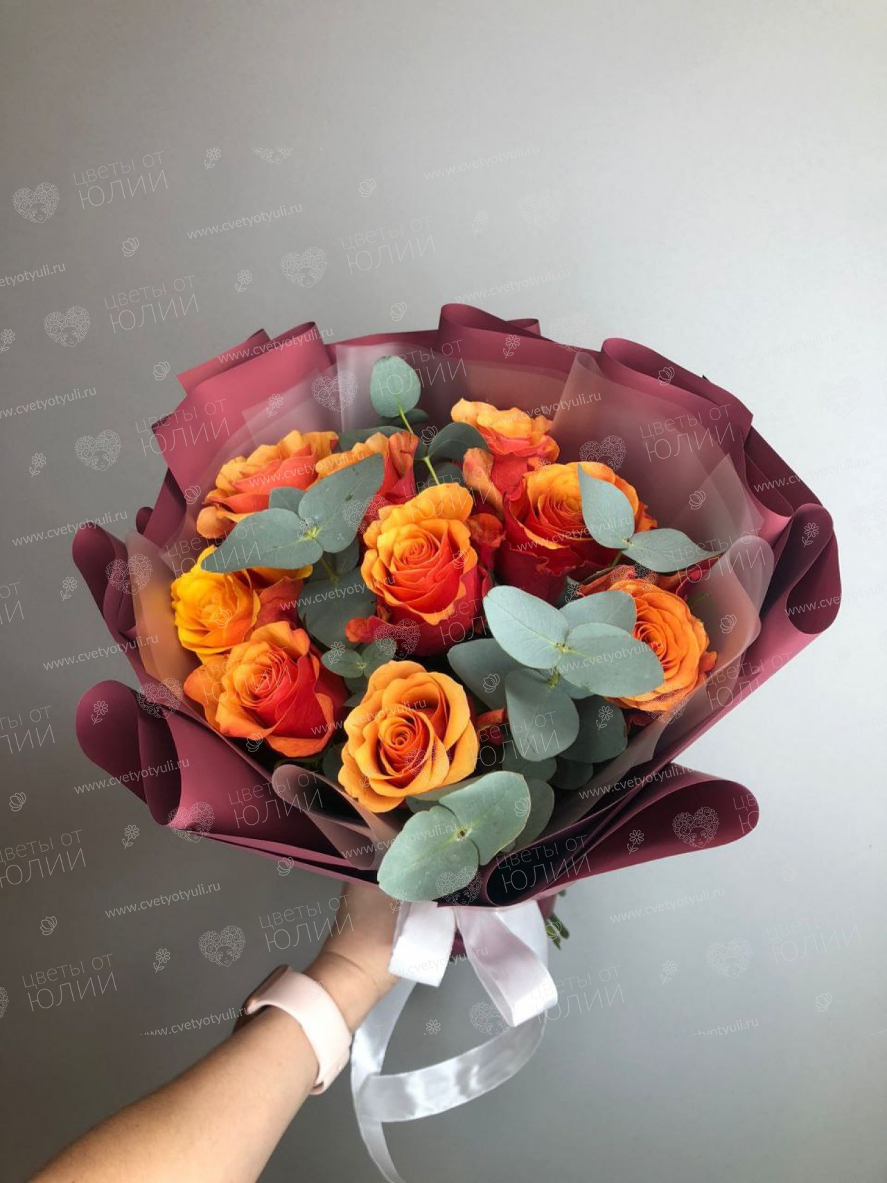 Букет 9 оранжевых роз с эвкалиптом
