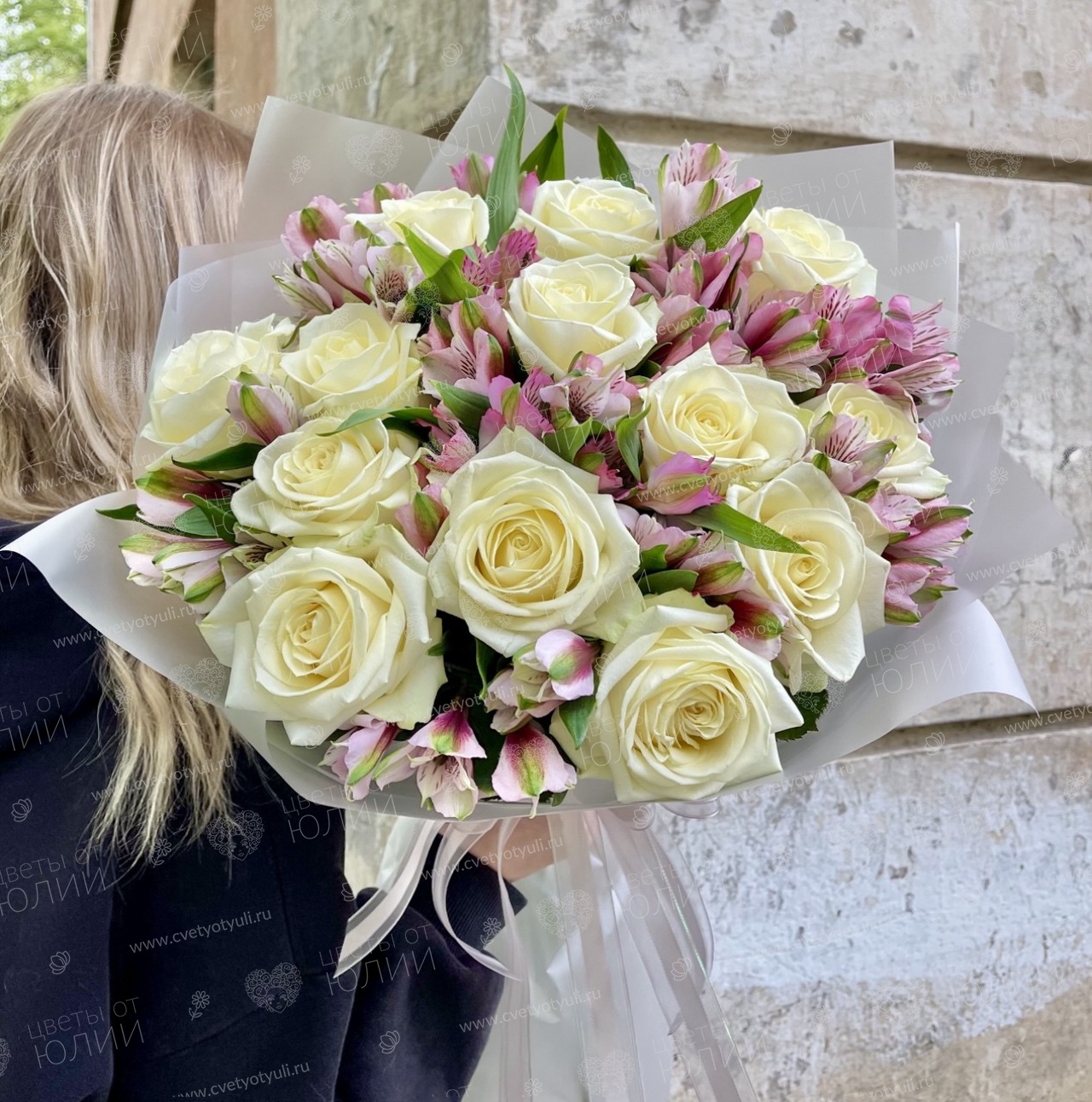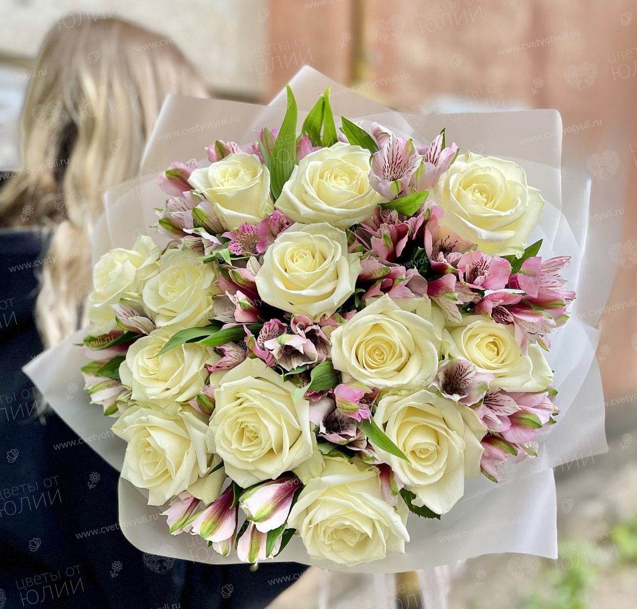 Альстромерия - 12 шт, Роза местная 50 см - 13 шт, Упаковка