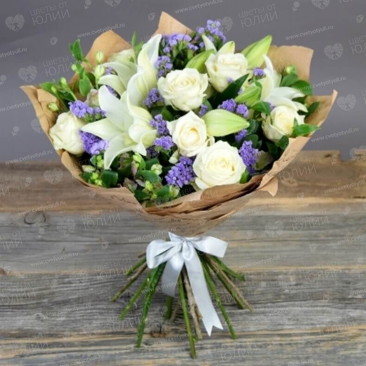 Лилия - 2 шт, роза - 7 шт, статица - 3 шт, альстромерия - 6 шт, зелень, упаковка, лента.
