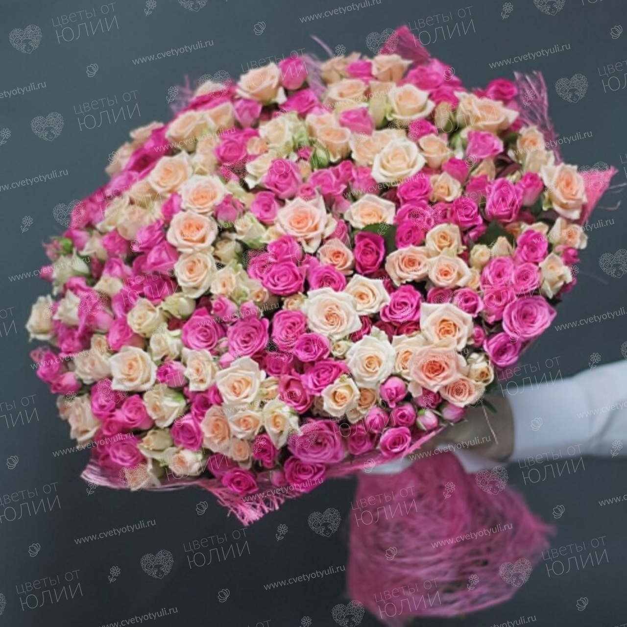 Роза кустовая 50 см - 101 шт, упаковка, лента.