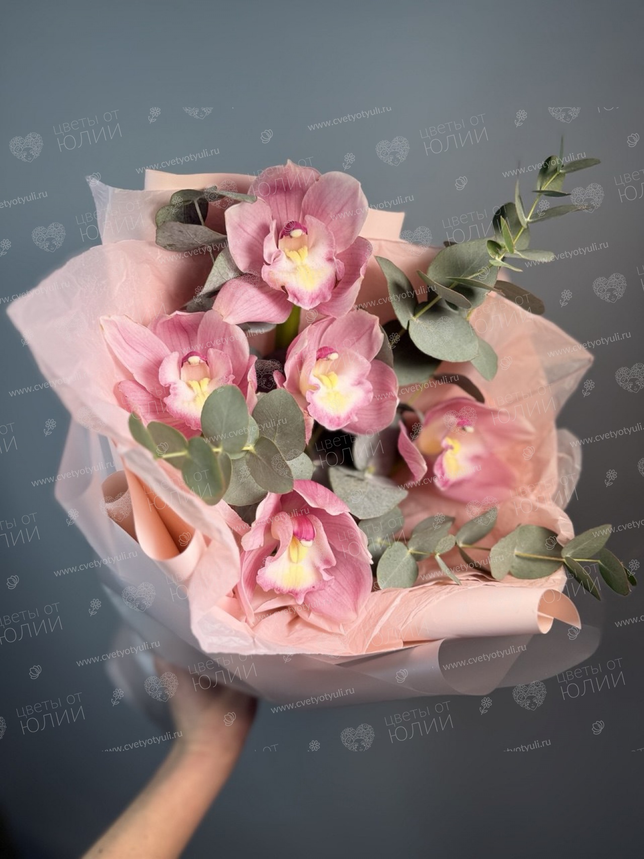 В основе букета — орхидеи цимбидиум с крупными головками свежего среза: каждый бутон уже раскрыт и демонстрирует бархатистые лепестки насыщенного розового цвета с кремово-жёлтой сердцевиной. Этот сорт орхидей отличается исключительной стойкостью и сохраняет декоративность значительно дольше большинства срезанных цветов. Лёгкие ветки эвкалипта добавляют букету воздушный объём и природную свежесть, мягко оттеняя розовую палитру серебристо-зелёным тоном. Композиция упакована в нежную пудрово-розовую флористическую бумагу с деликатными складками, которая подчёркивает роскошный характер букета и завершена атласной лентой.