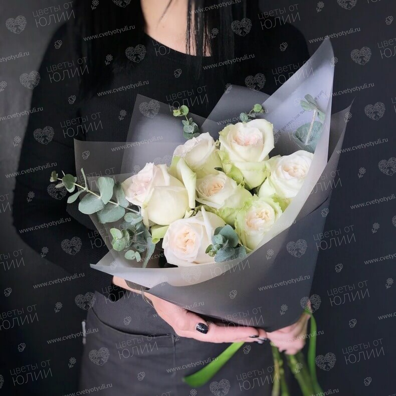 Роза эквадор 60 см - 7 шт, эвкалипт, упаковка, лента.