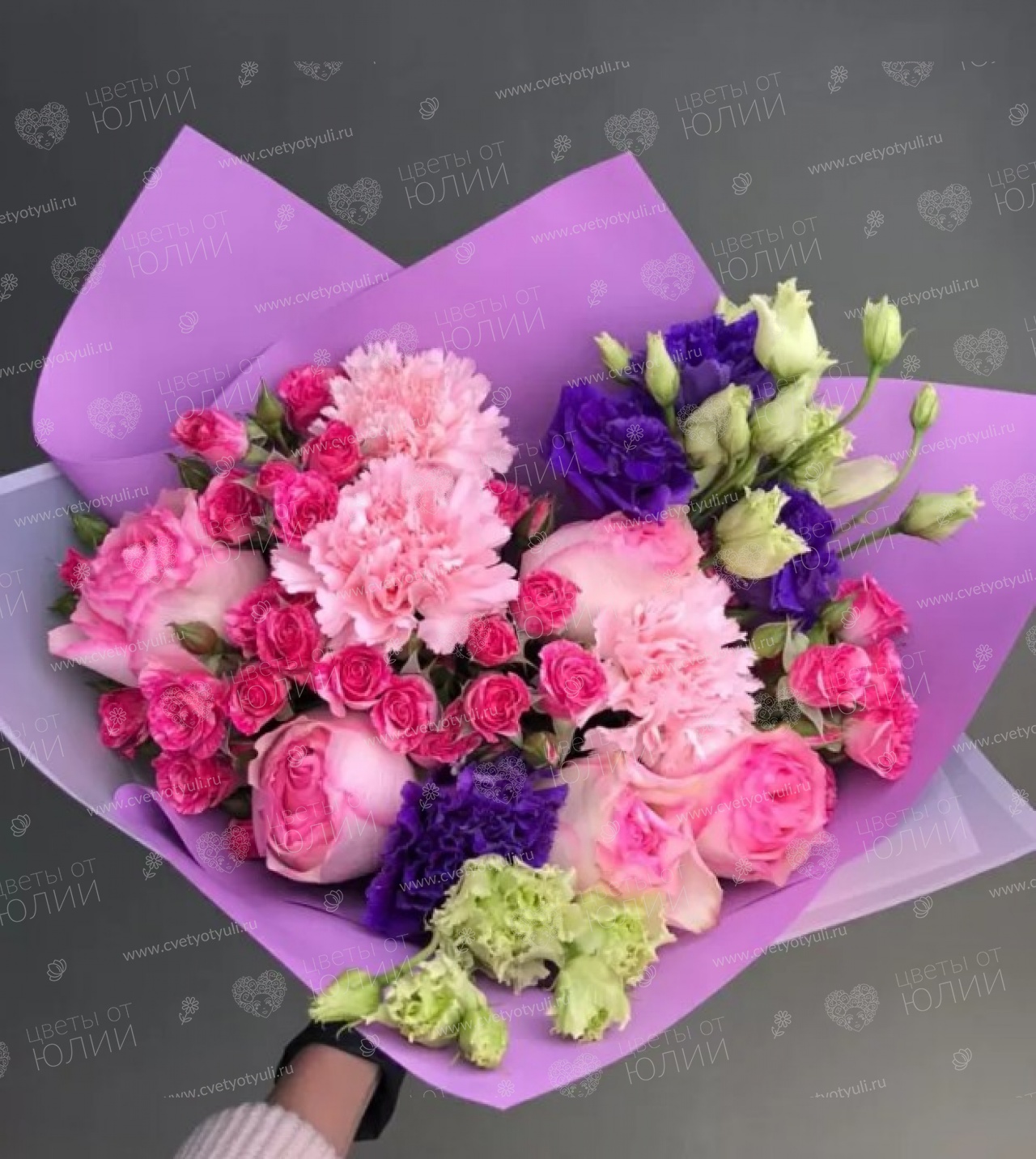 Роза - 4 шт, роза кустовая - 5 шт, эустома - 2 шт, гвоздика - 3 шт, упаковка, лента.
