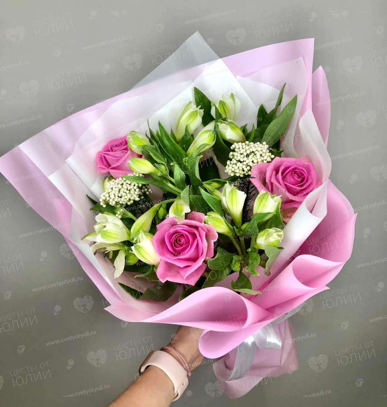 • Состав: Розы, Альстромерии, Упаковка, Зелень