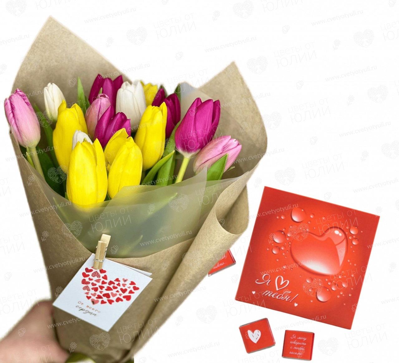 Тюльпан-15 шт, упаковка, лента, коробочка с 9 шоколадками, открытка