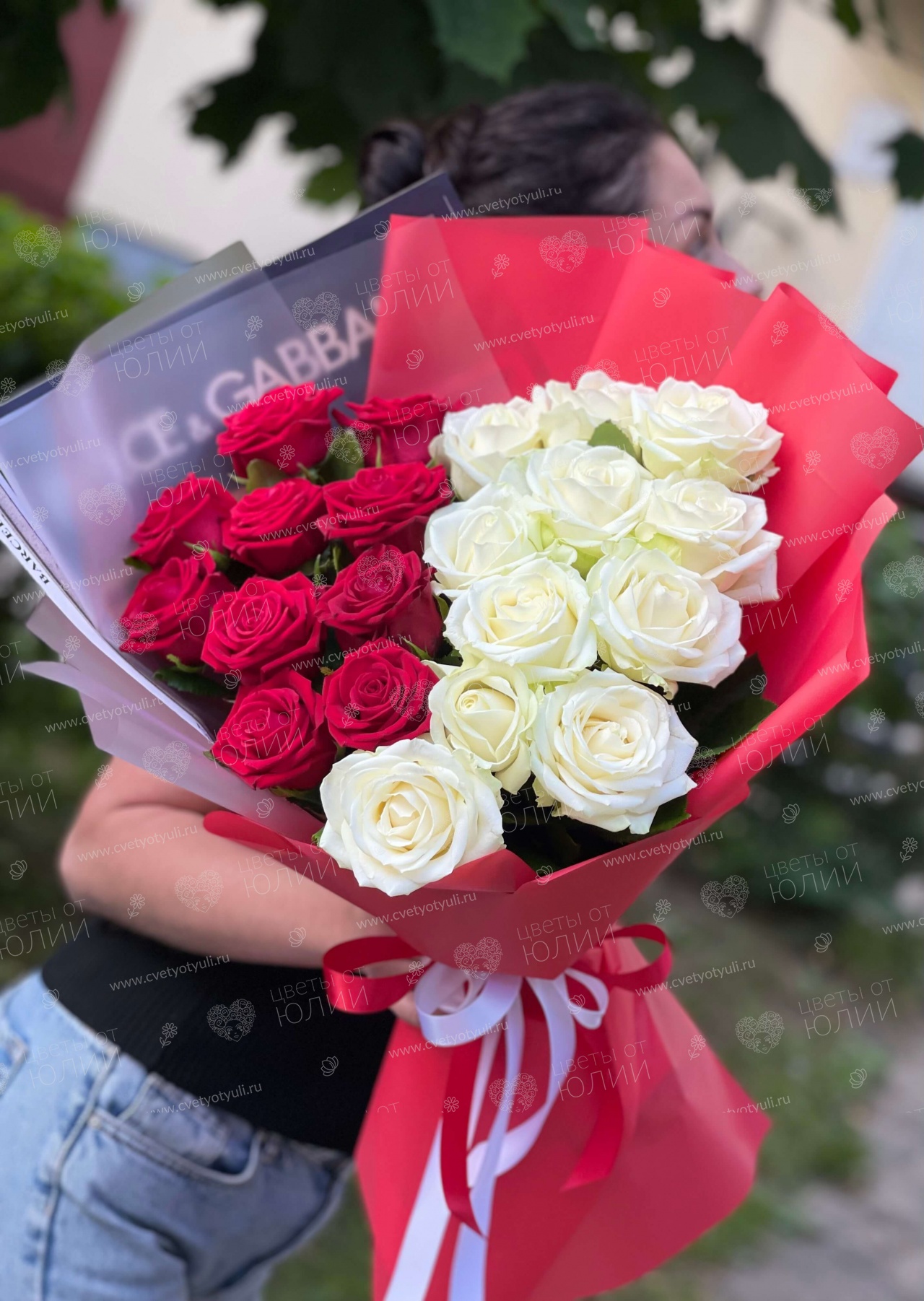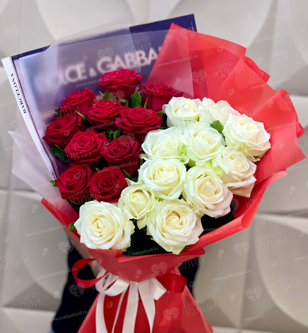 Роза 50 см - 21 шт, упаковка, атласная ленточка