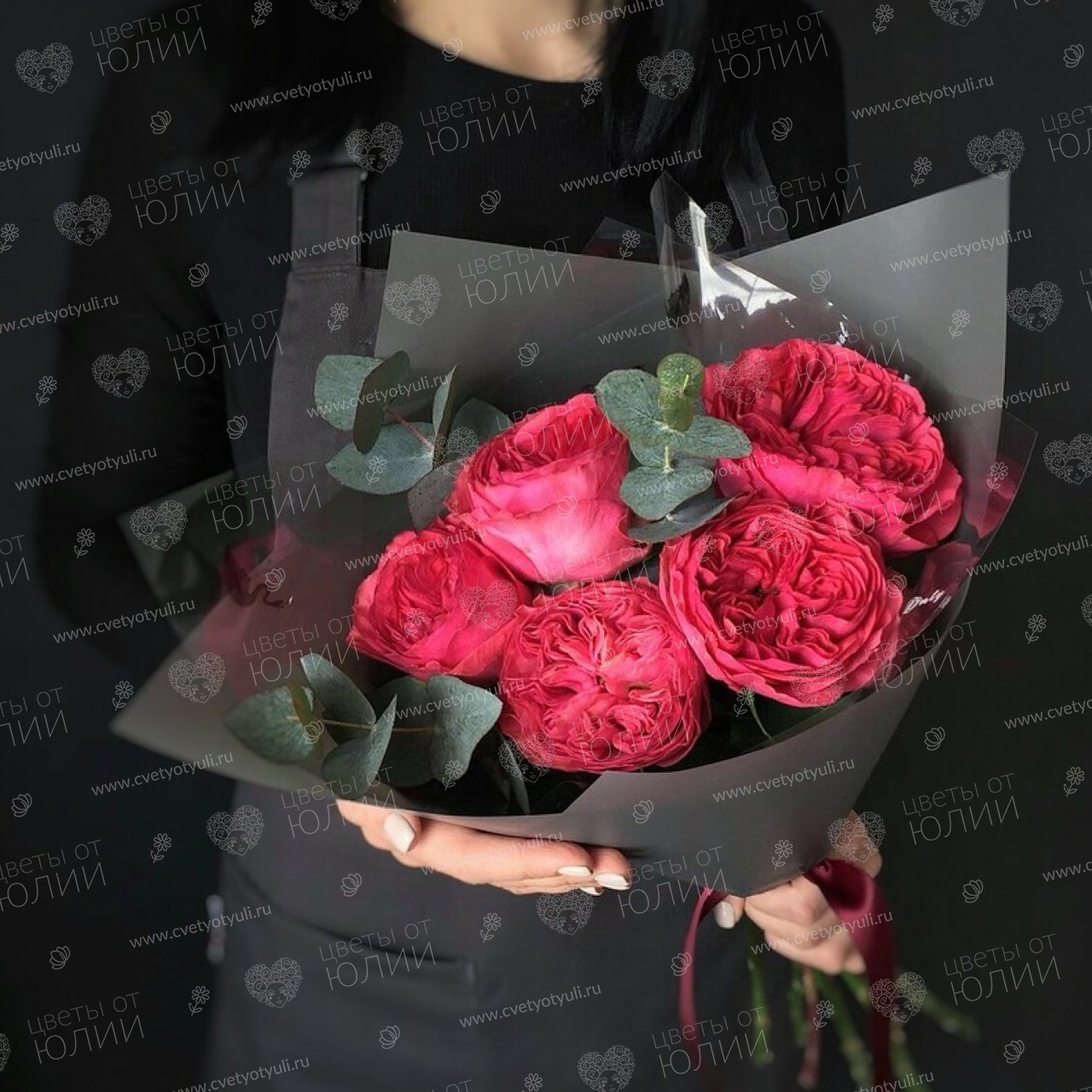 Роза пионовиная - 5 шт, эвкалипт, упаковка, лента.
