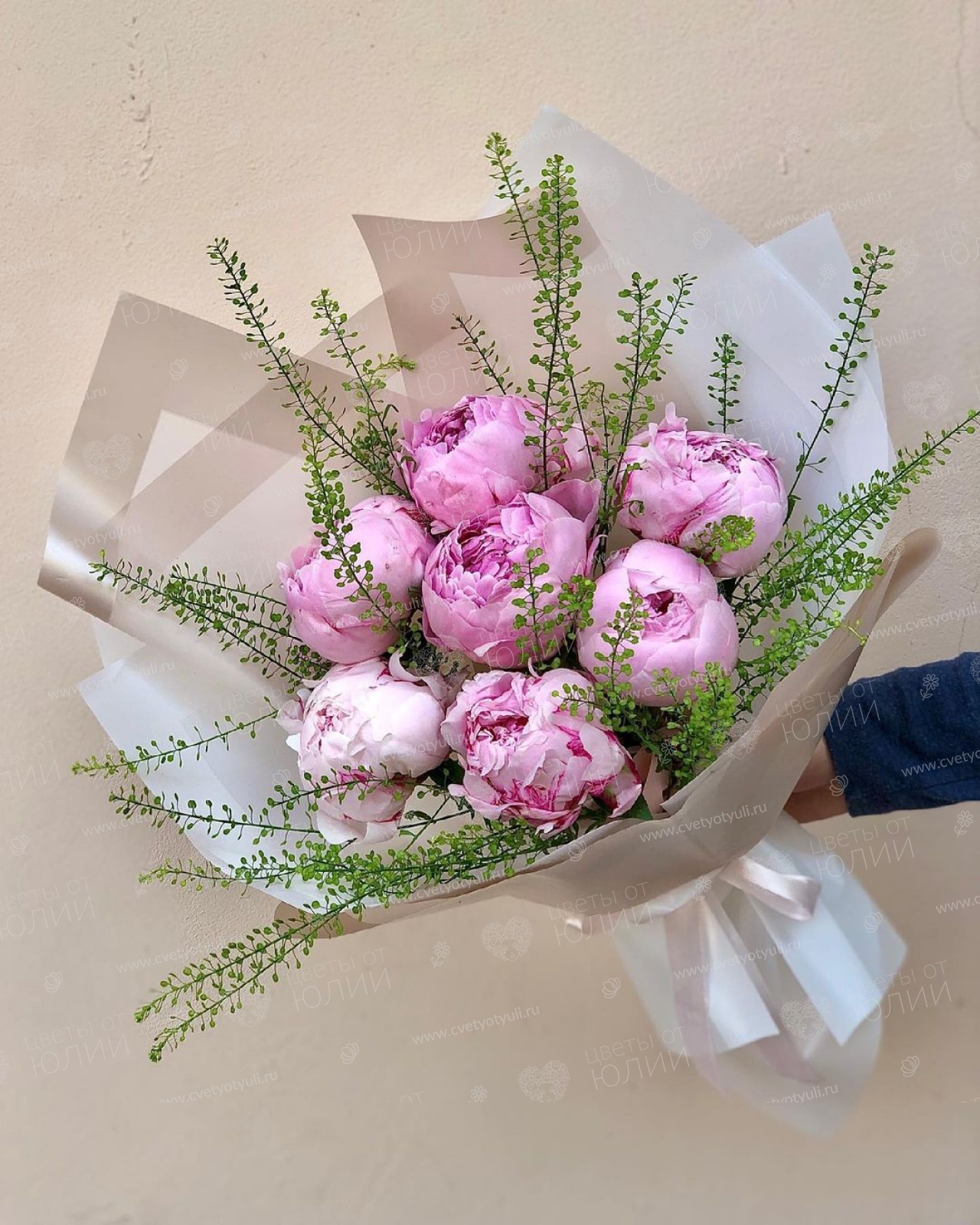 Букет из 7 пионов в зеленью