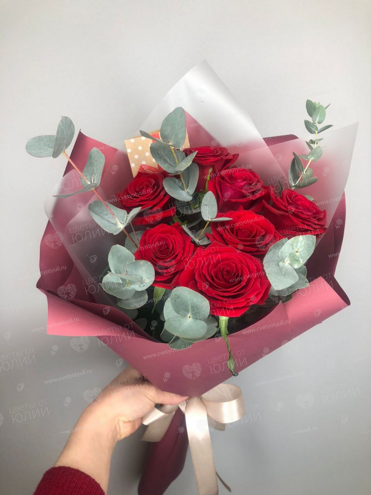 Роза 40 см - 7 шт, эвкалипт, упаковка, атласная