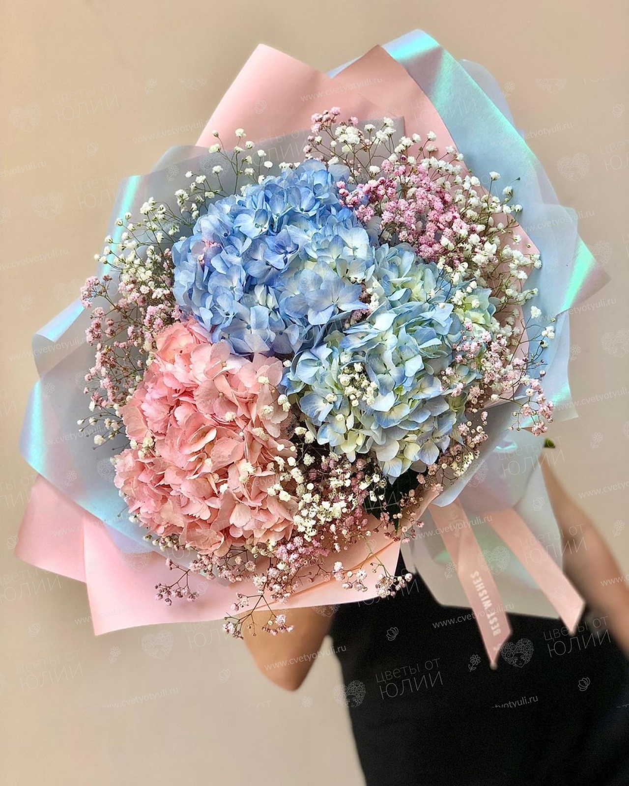 Гортензия - 3 шт, гипсофила - 4 шт, упаковка, лента.