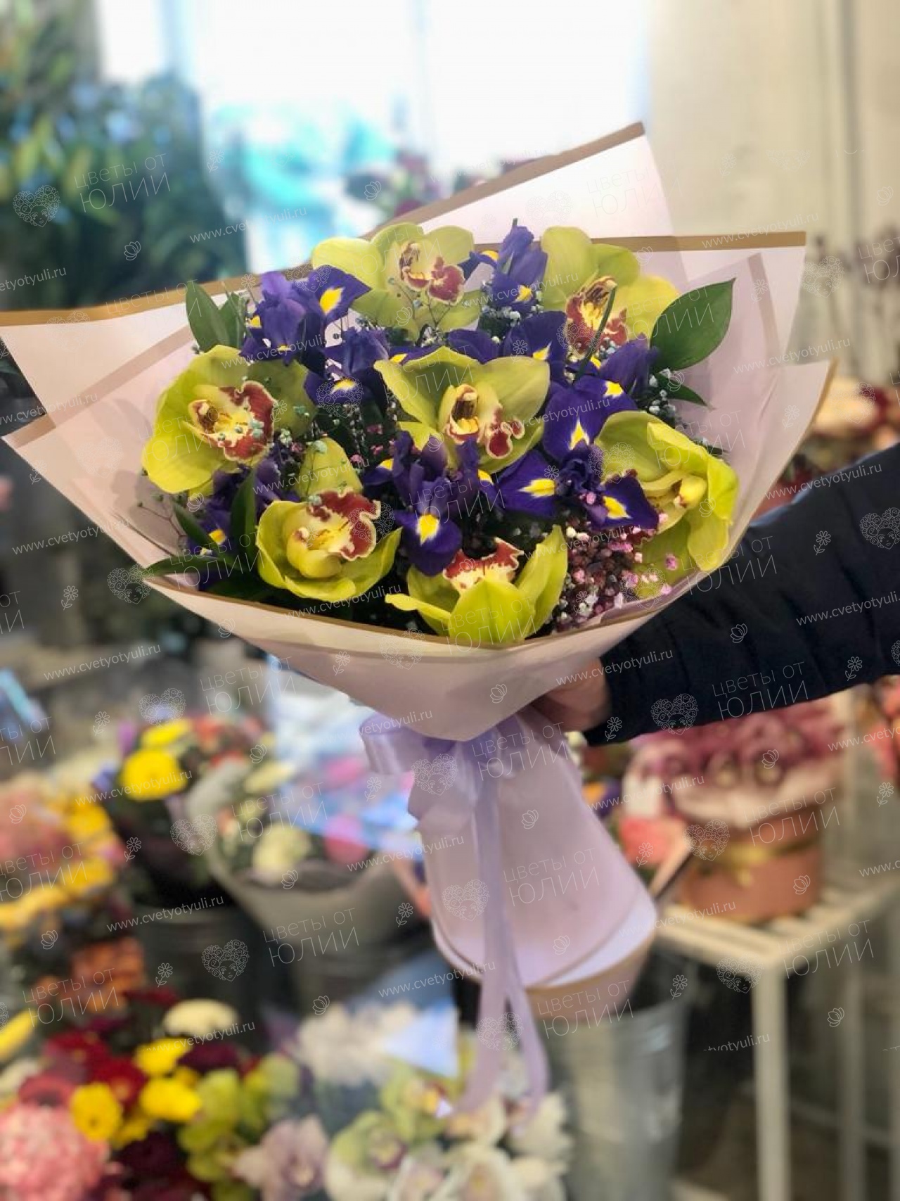 • Состав: Ирисы, Орхидеи, Упаковка, Зелень