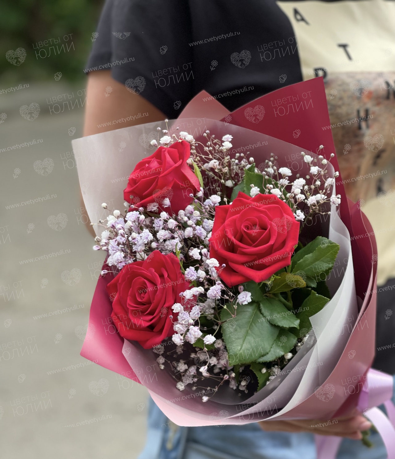 • Состав: Розы, Упаковка, Гипсофила, Зелень