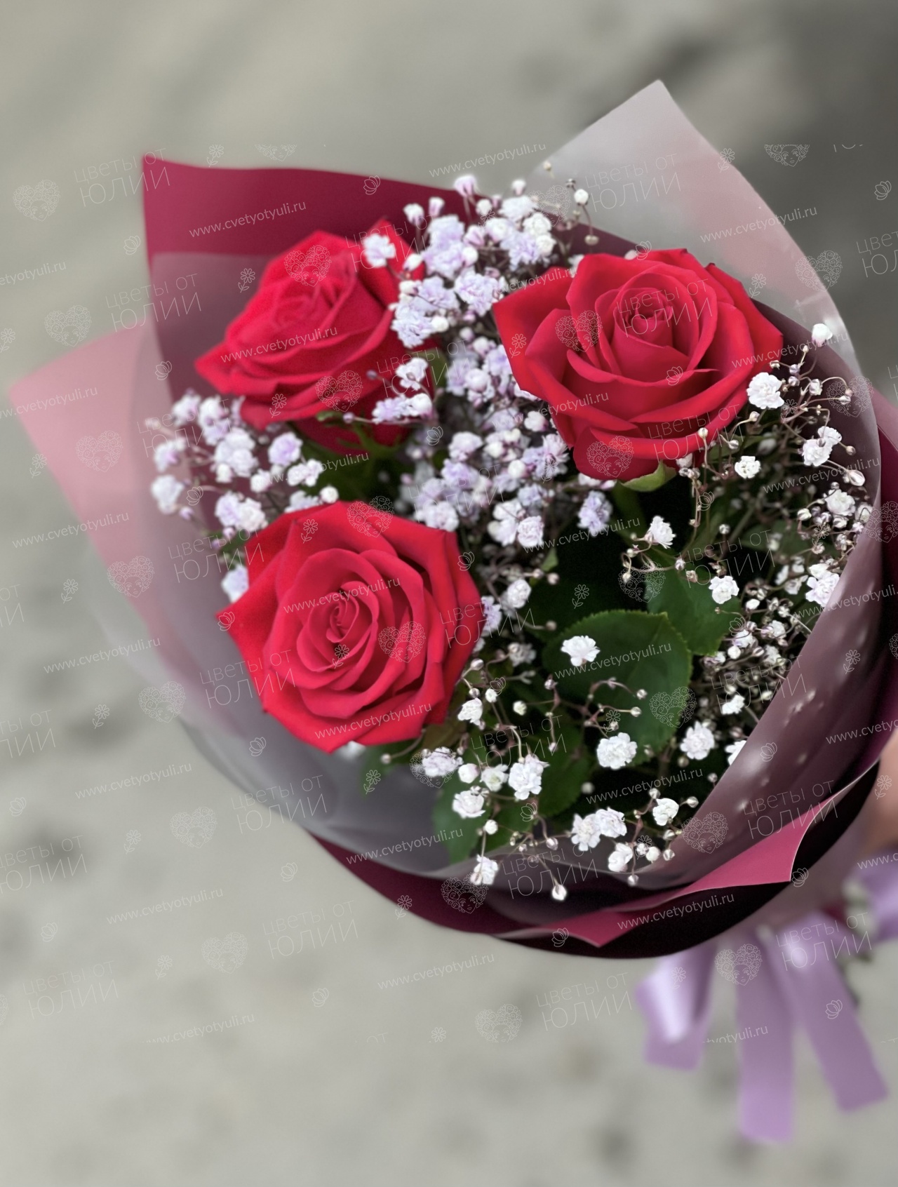 Роза 40-50 см 3 шт, гипсофила - 1 шт, упаковка, атласная лента.