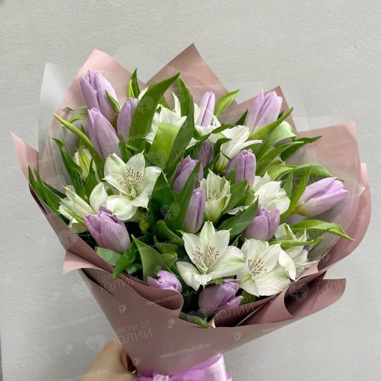 Мы используем лавандовые тюльпаны с крупными плотными бутонами свежего среза, которые раскрываются постепенно, сохраняя декоративность до недели. Изящные белые альстромерии с нежными крапинками добавляют легкости и продлевают жизнь композиции. Контрастная упаковка в пудрово-коричневых тонах подчеркивает нежность сиреневых оттенков, а атласная лента завершает букет элегантным акцентом.