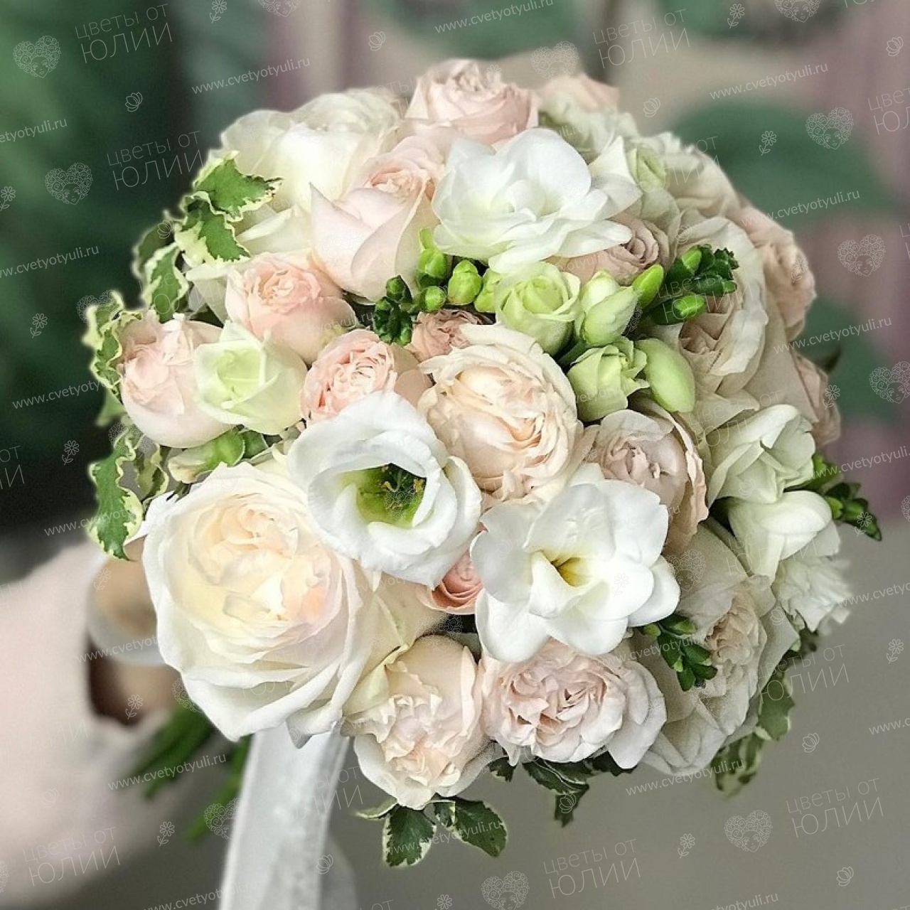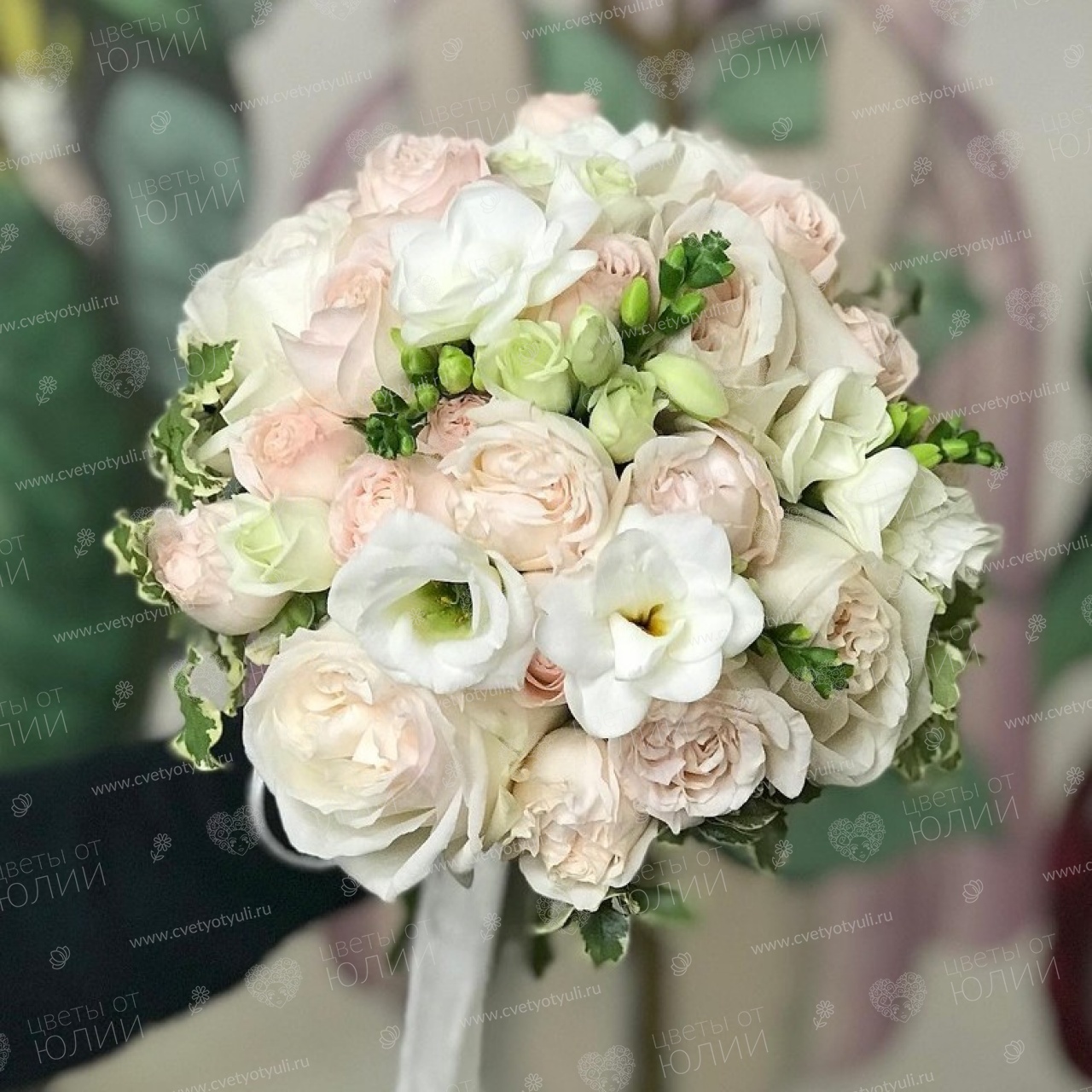 Роза пионовидная - 4 шт, фрезия - 7 шт, эустома - 1 шт, зелень, лента.