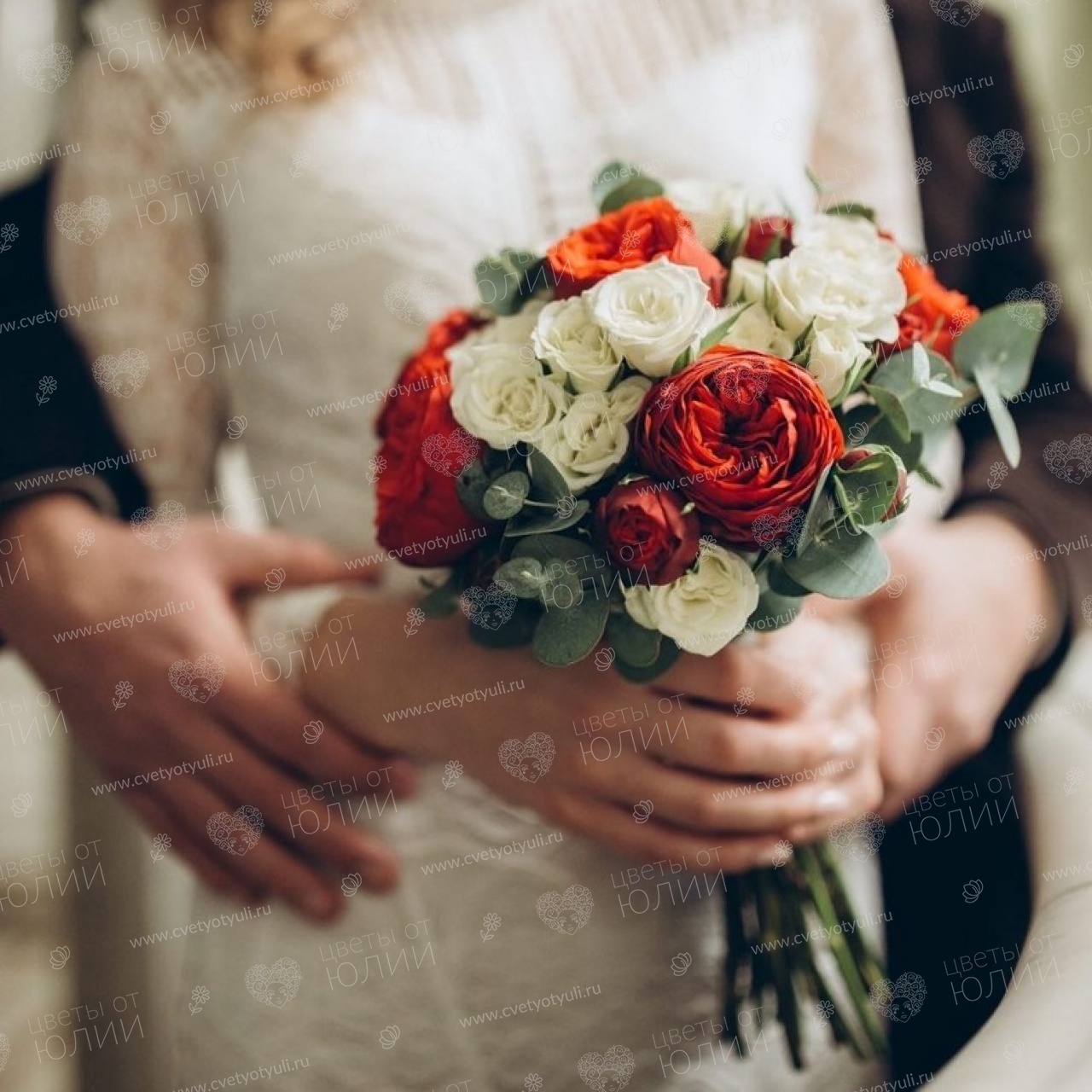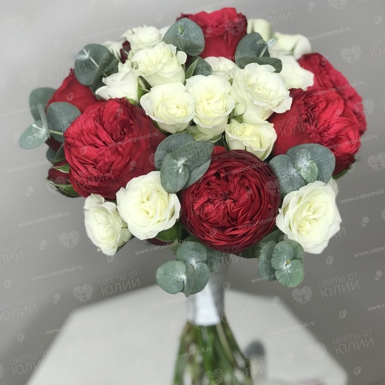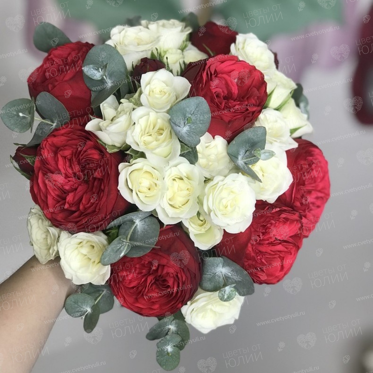 Роза пионовидная кустовая - 5 шт, роза кустовая - 6 шт, эвкалипт.