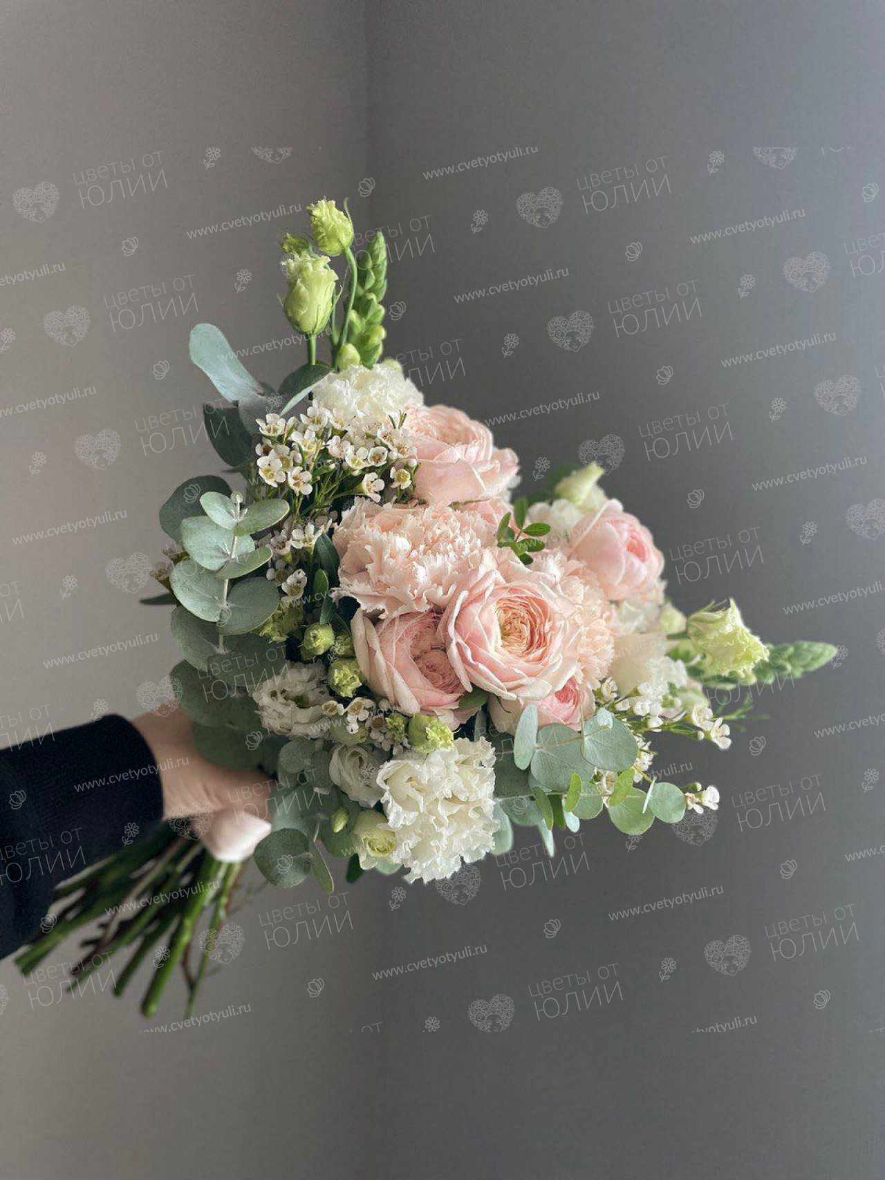 Диантус - 3 шт, Лента, Роза кустовая пионовидная 70 см - 2 шт, Хамелациум (ваксфлауэр) - 2 шт, Эвкалипт- 1 шт, Эустома - 2 шт