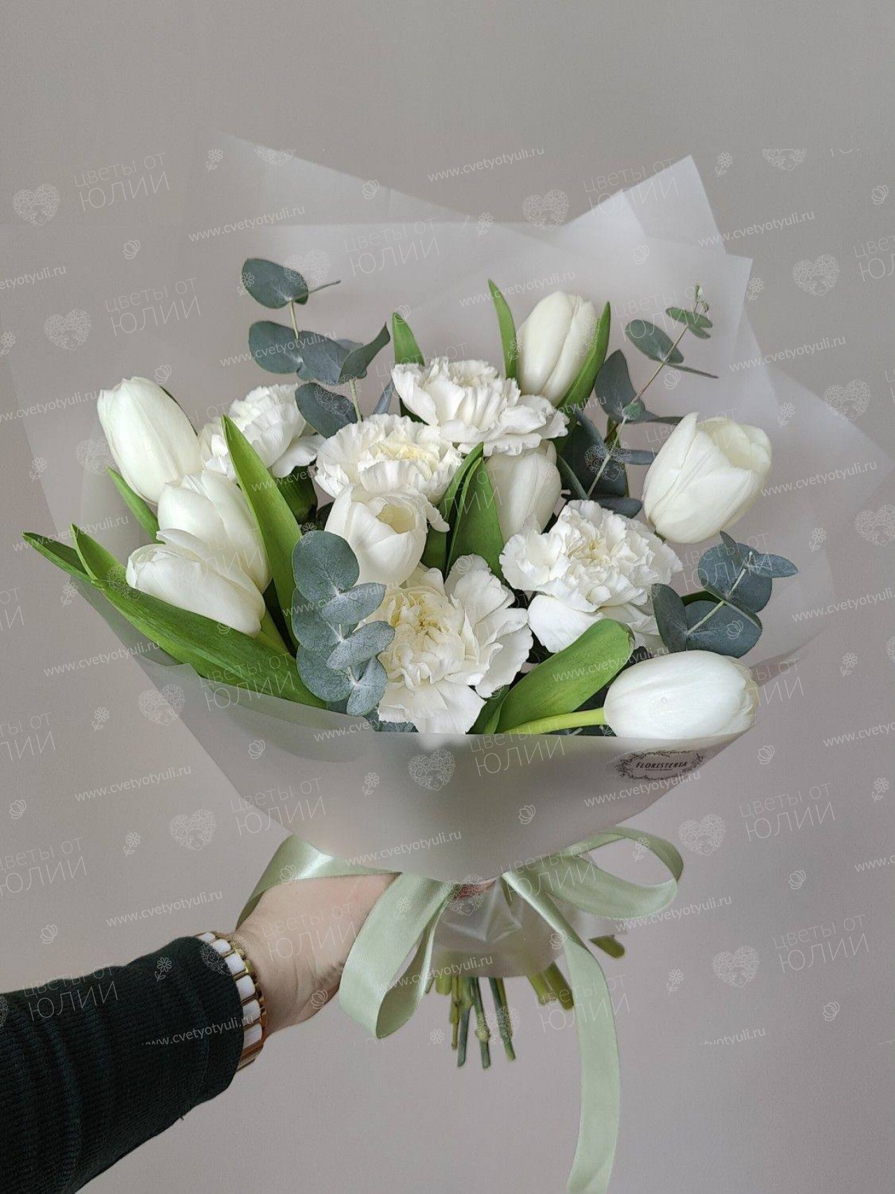 Мы используем белые тюльпаны с плотными бутонами и свежим срезом, которые раскрываются постепенно, сохраняя декоративность. Махровые гвоздики добавляют объем и текстуру, а веточки благородного эвкалипта придают композиции свежесть и долговечность. Дизайнерская упаковка в молочных тонах с атласной лентой подчеркивает изысканность букета.