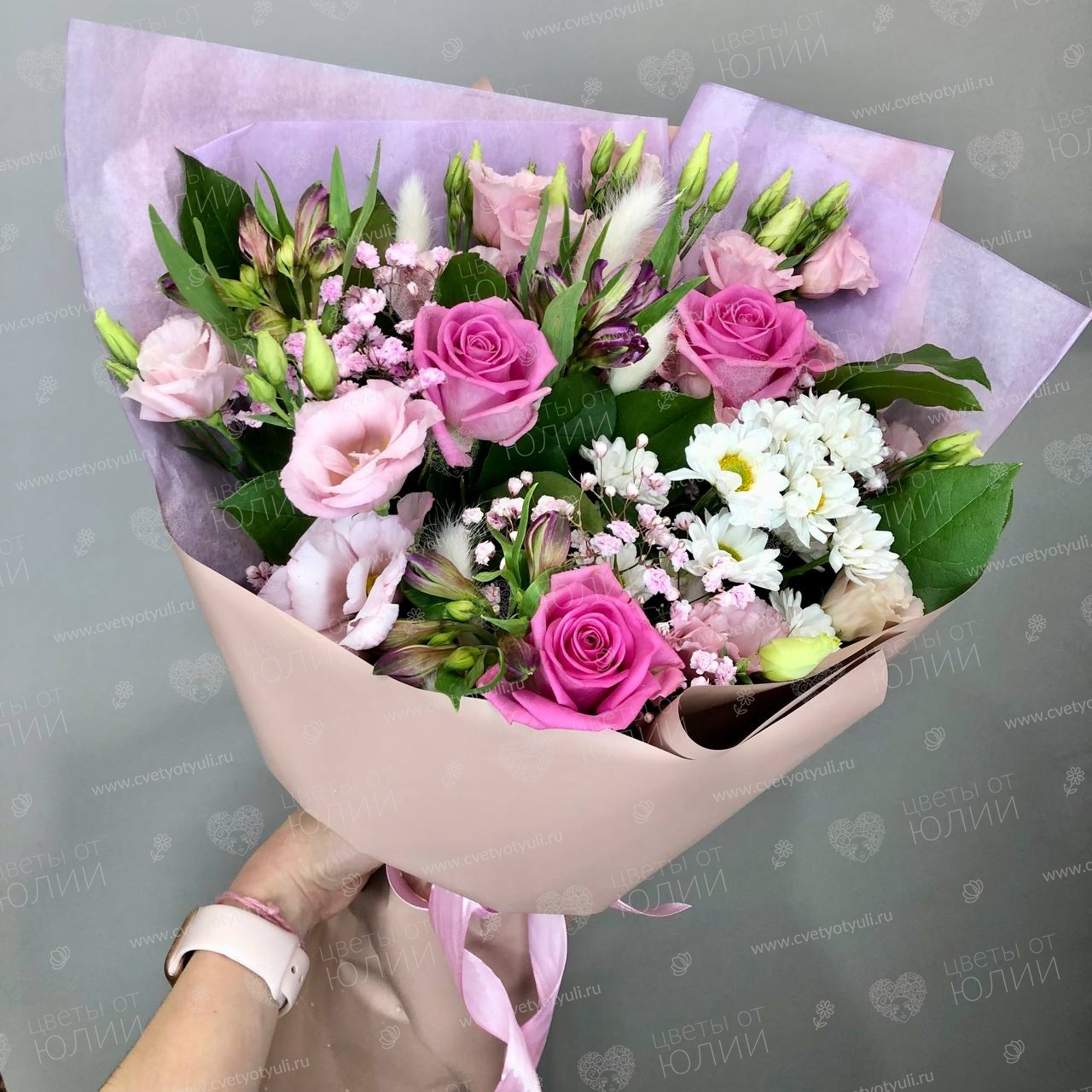 • Состав: Лизиантус, Розы, Упаковка, Зелень, Альстромерии, Хризантемы, Гипсофила