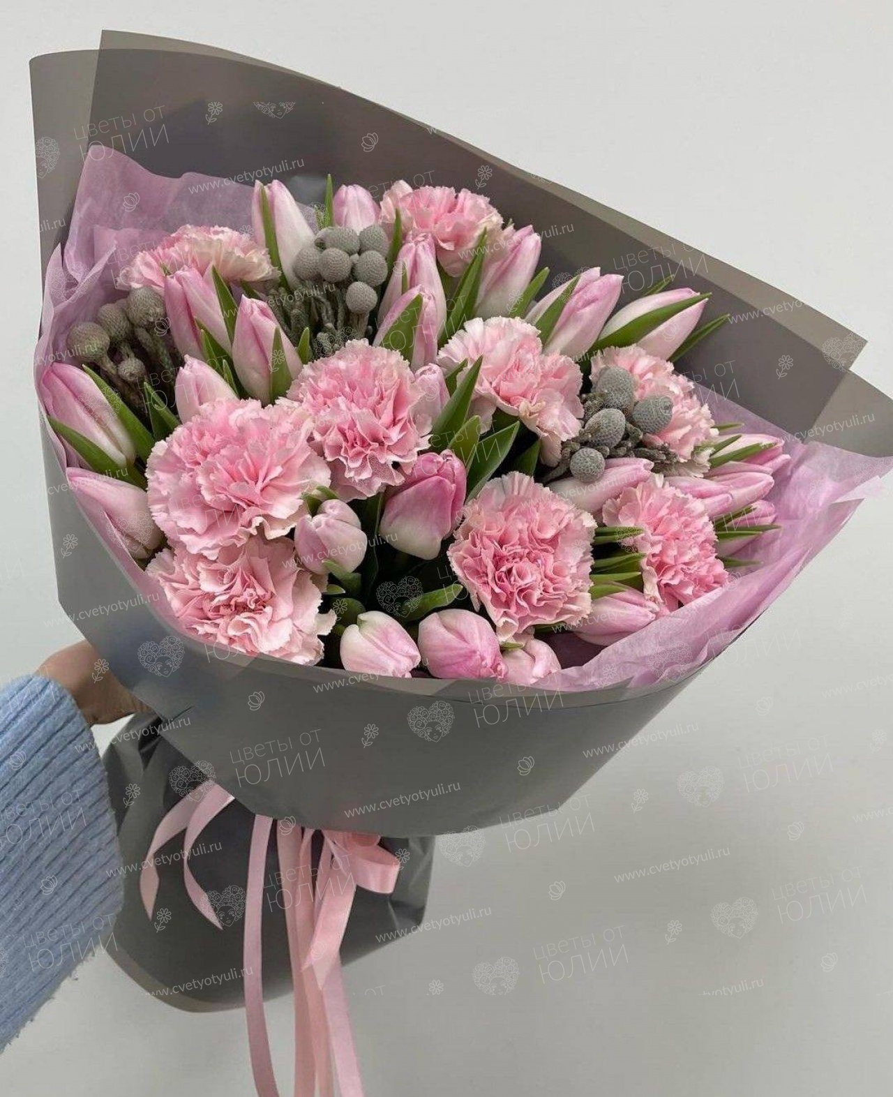 В букете используются розовые тюльпаны с крупными плотными бутонами свежего среза, которые раскрываются постепенно, меняя оттенок от бледно-розового до насыщенного. Махровые гвоздики добавляют игру текстур, а серебристые веточки озотамнуса придают благородство и изысканность. Элегантная упаковка в серо-розовых тонах с атласными лентами подчеркивает нежность композиции.