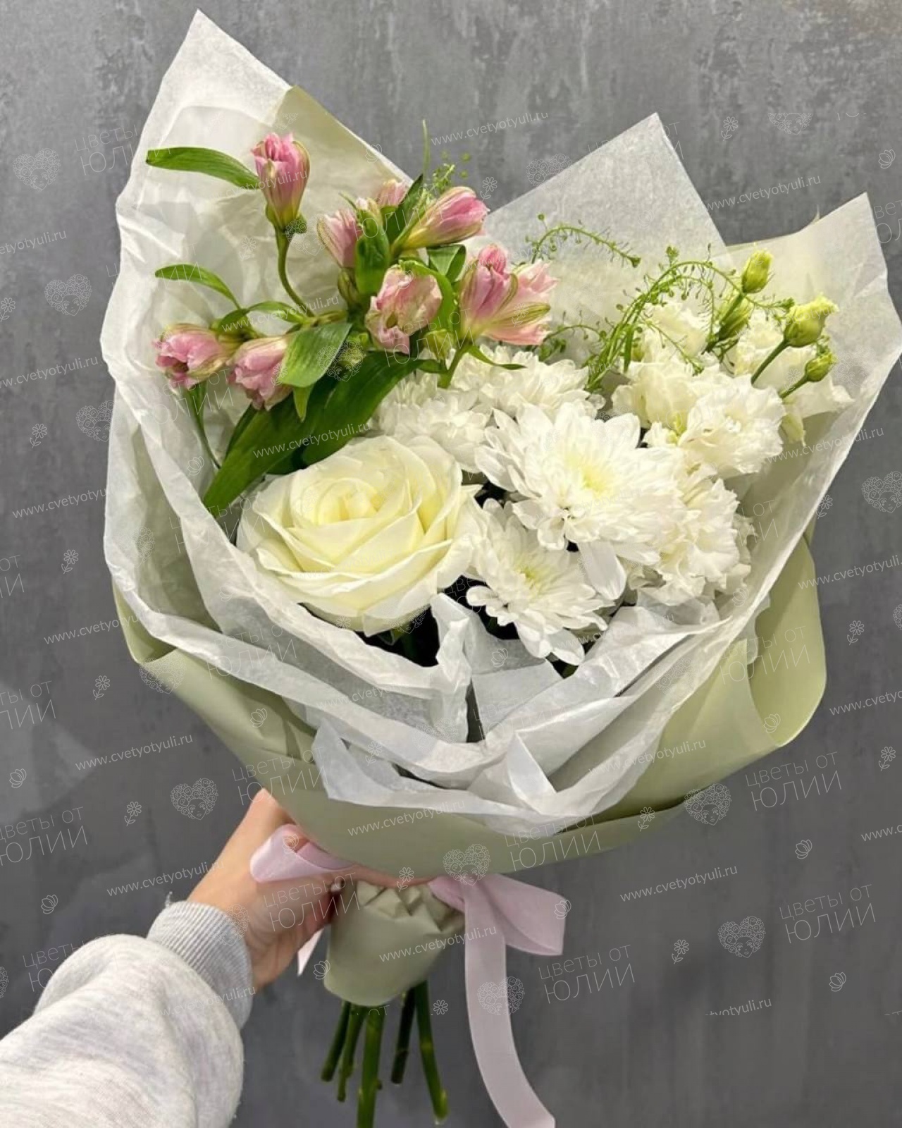 Альстромерия - 2 шт, Атласная лента, Роза местная 50 см, Тласпи, Упаковка, Хризантема кустовая, Эустома