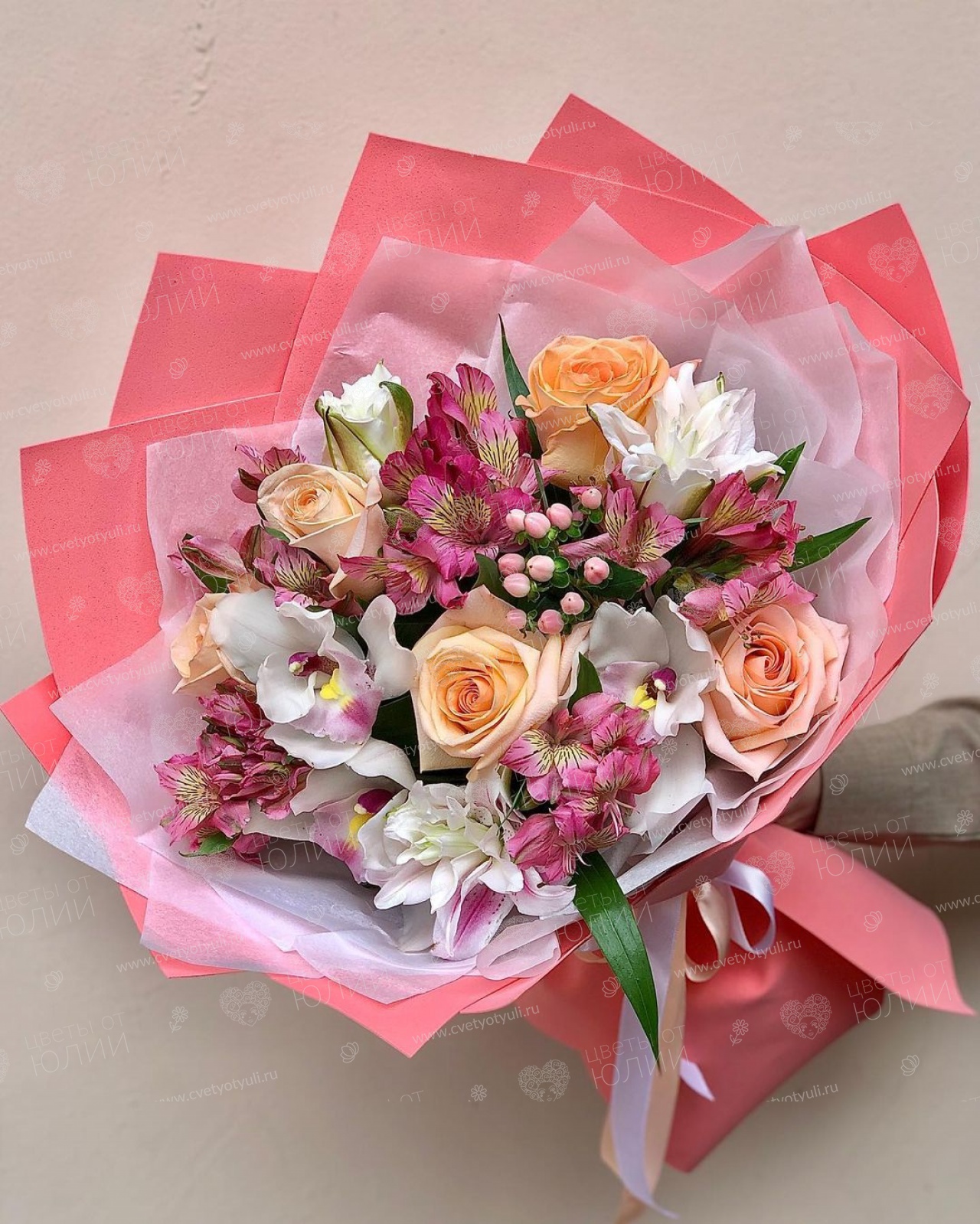 Роза 40 см - 5 шт, гиперикум - 1 шт, альстромерия - 5 шт, орхидея - 2 шт, лилия - 1 шт, упаковка, лента.