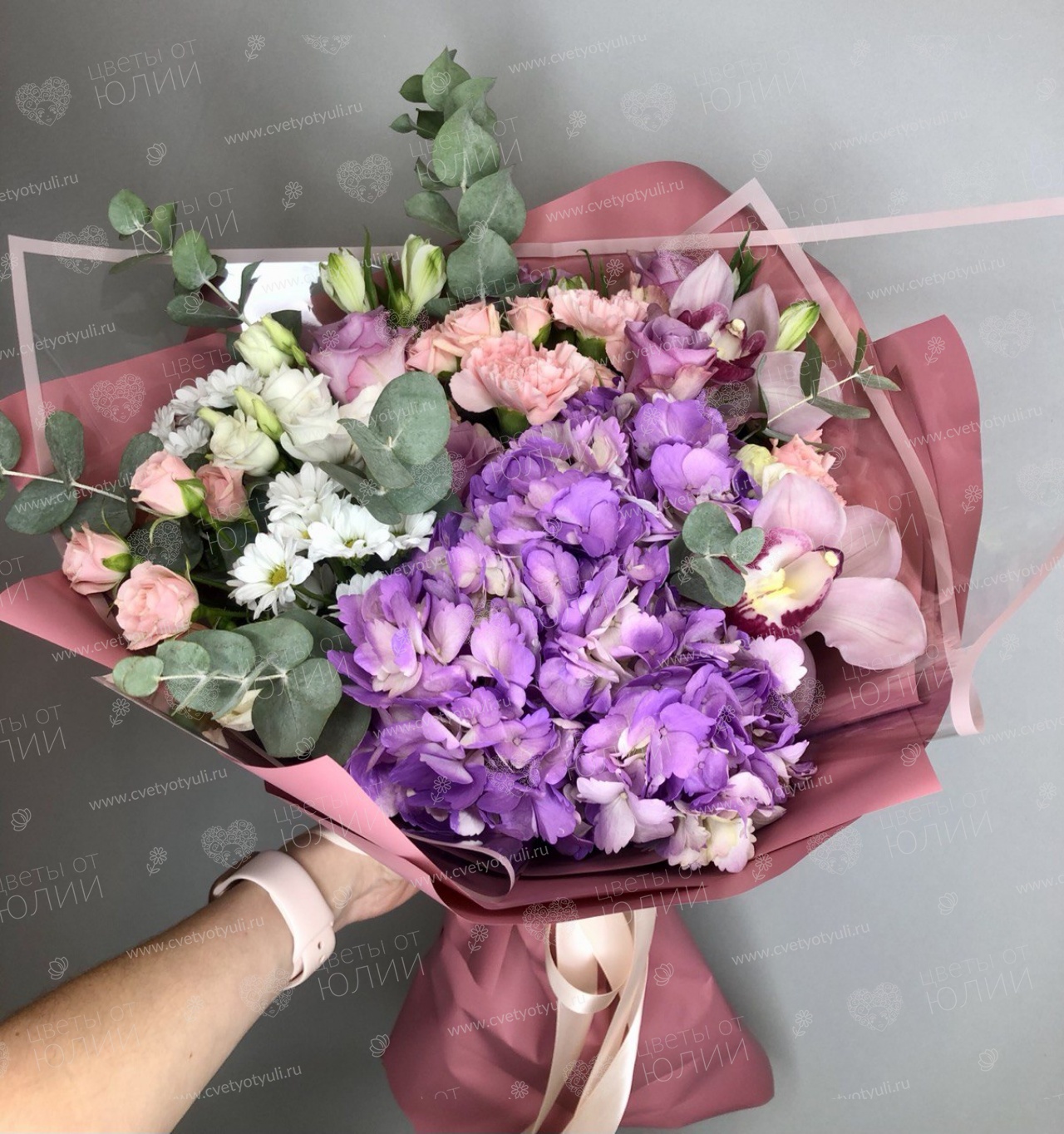 • Состав: Альстромерии, Лизиантус, Хризантемы, Гортензии, Орхидеи, Розы, Упаковка, Зелень