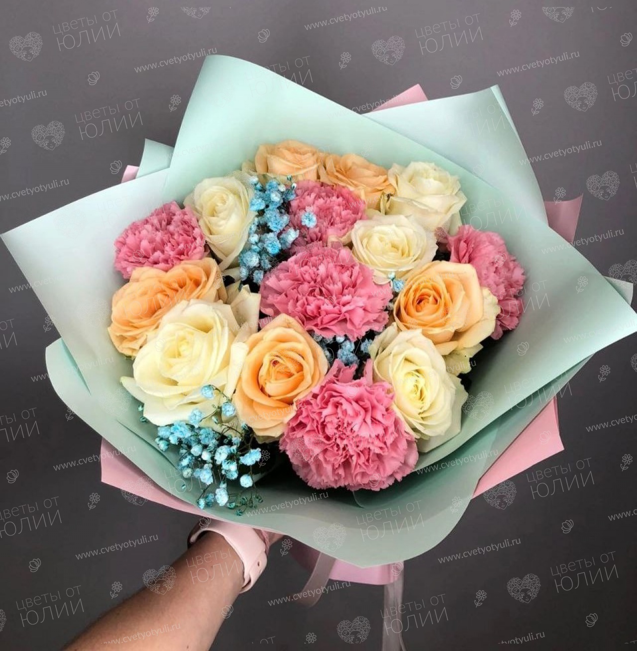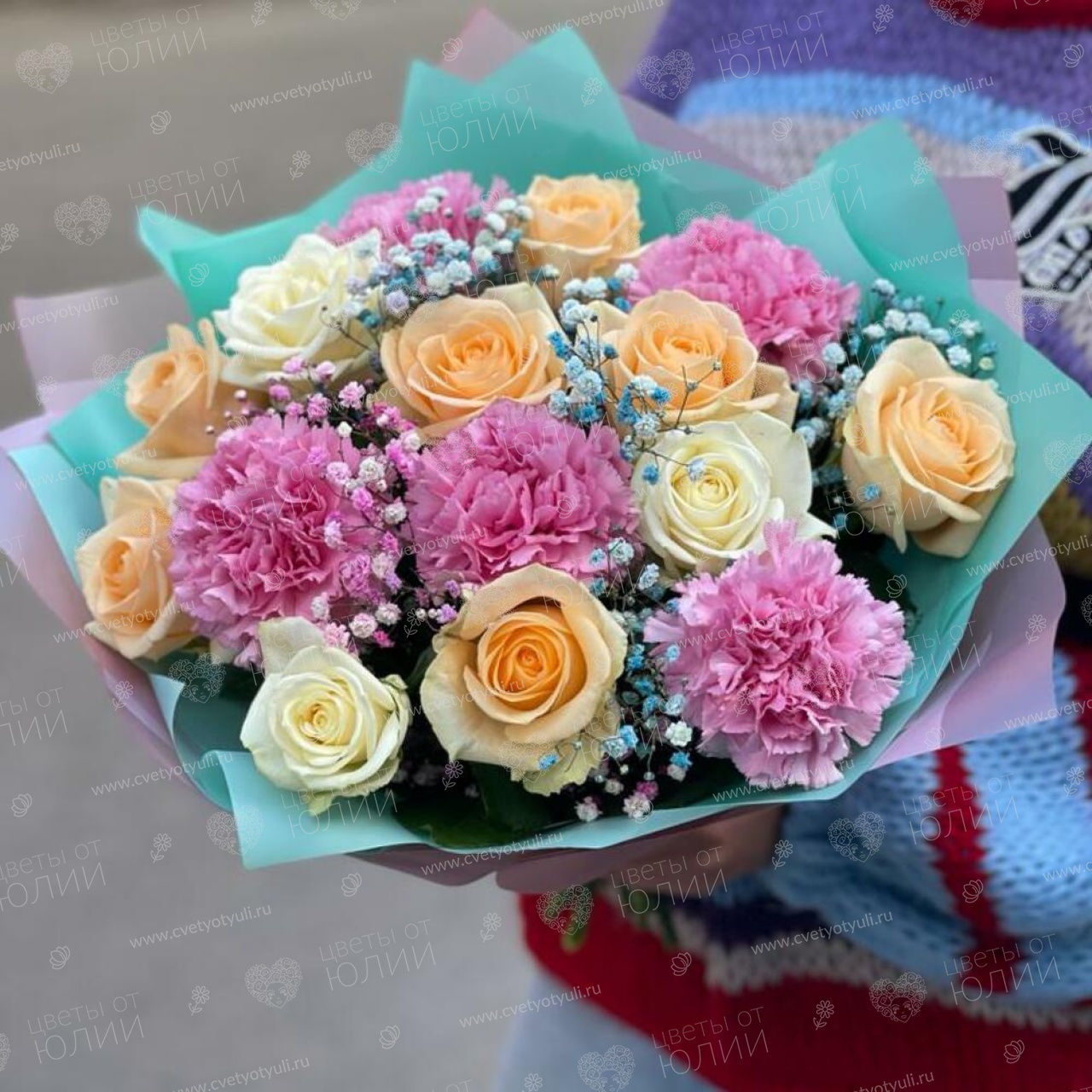 Роза 40 см - 10 шт, гвоздика - 5 шт, гипсофила, упаковка, лента.