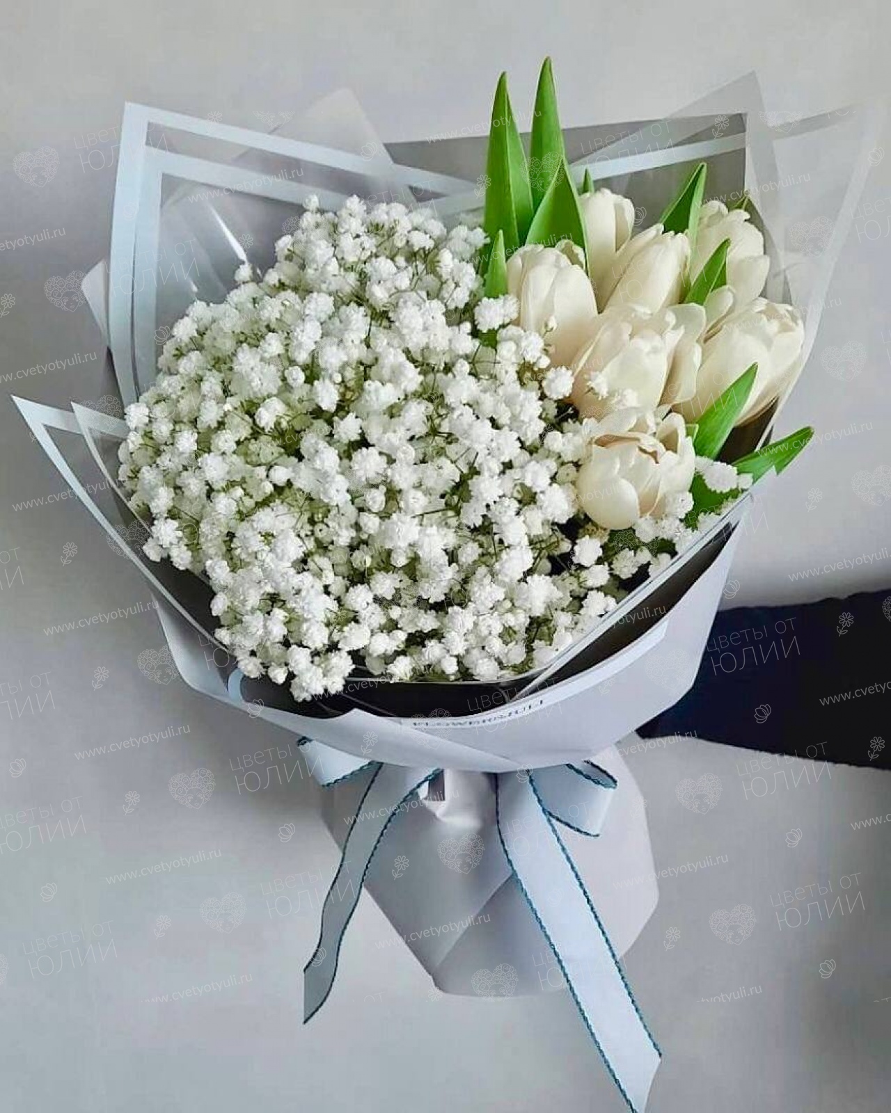Букет «Снежная дымка» — воплощение чистоты и лёгкости: белоснежные тюльпаны с плотными бутонами утопают в пышном облаке гипсофилы, создавая нежный контраст форм и текстур. Это безупречный подарок на 8 Марта, день рождения, годовщину или любое событие, которое хочется отметить особенно трогательно.