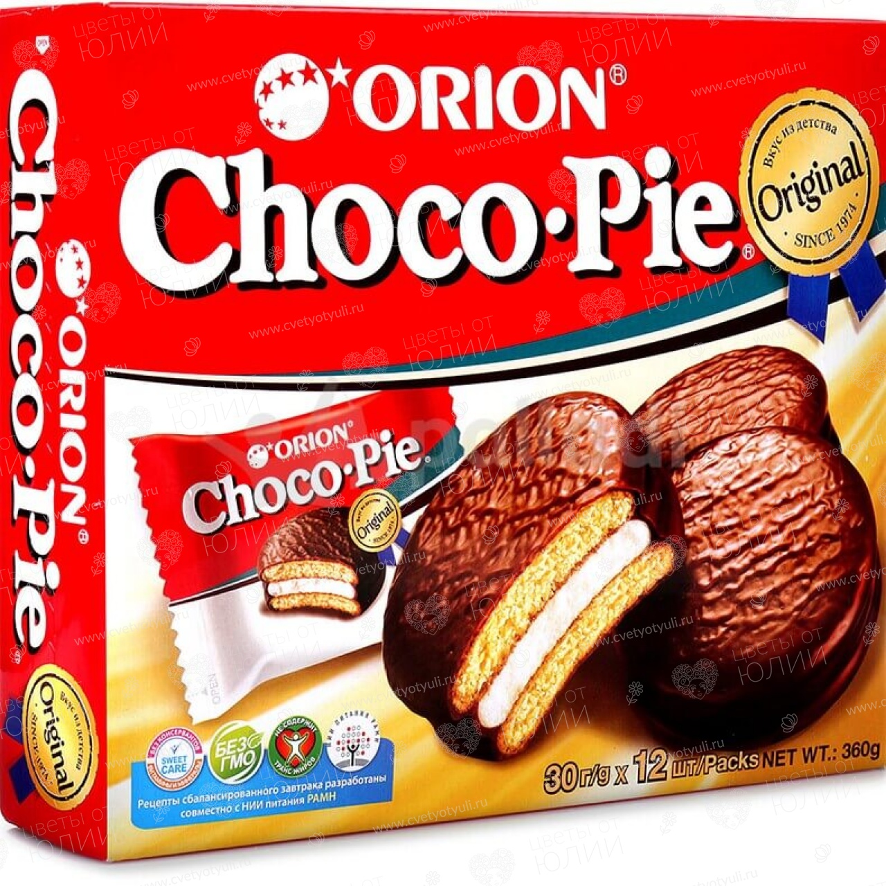 Бисквитное печенье "CHOCO PIE". Вес печенья 336 гр. Обращаем Ваше внимание, что печенье без цветов не доставляется, а идут дополнением к букету.