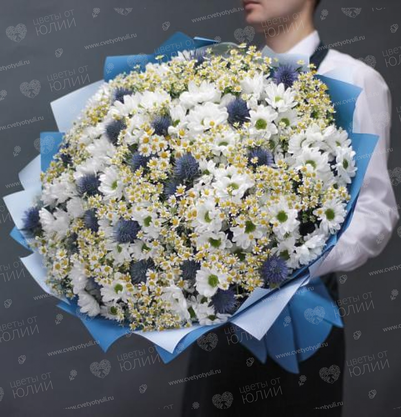 Хризантема кустовая - 15 шт, танацетум - 20 шт, ирингиум - 10 шт, упаковка, лента.