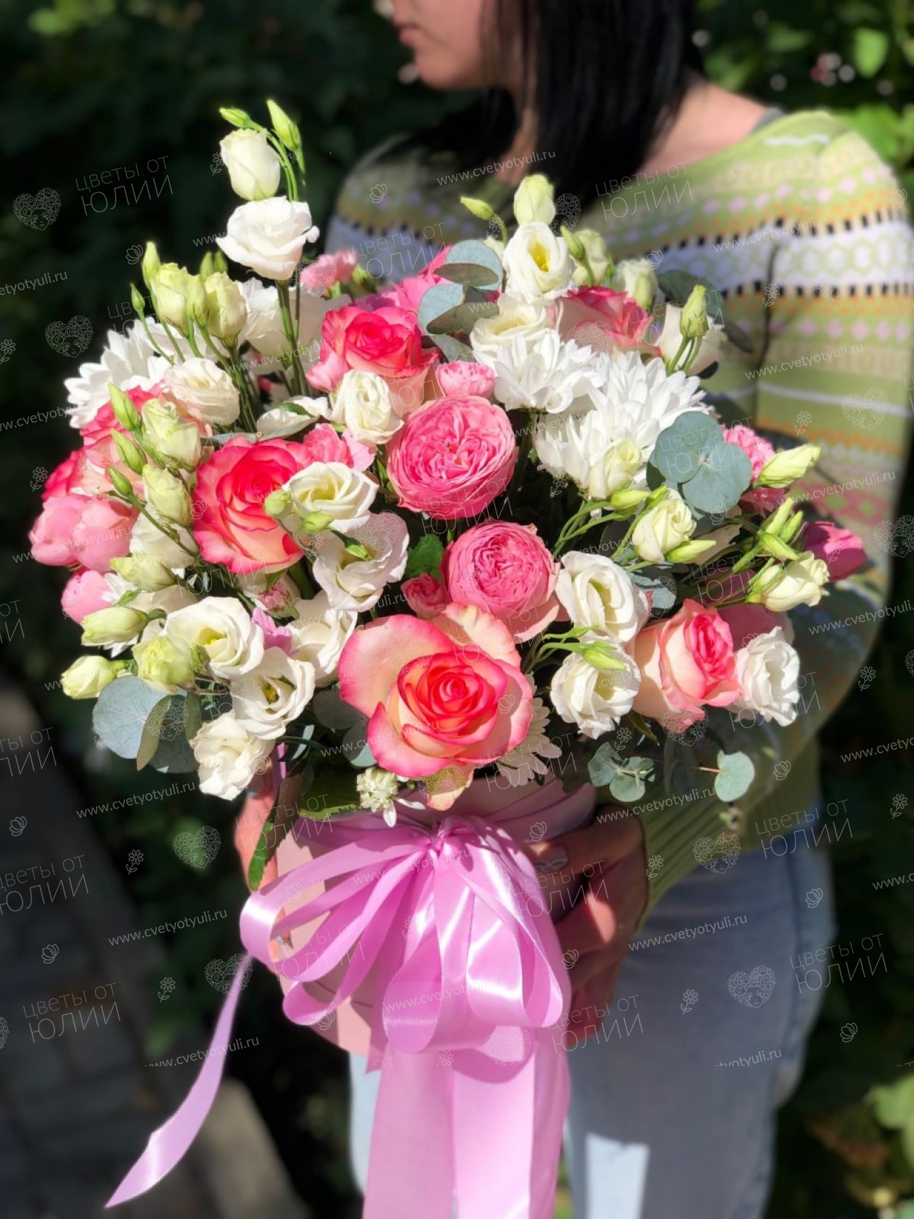 Коробка роз и эустом Горсия