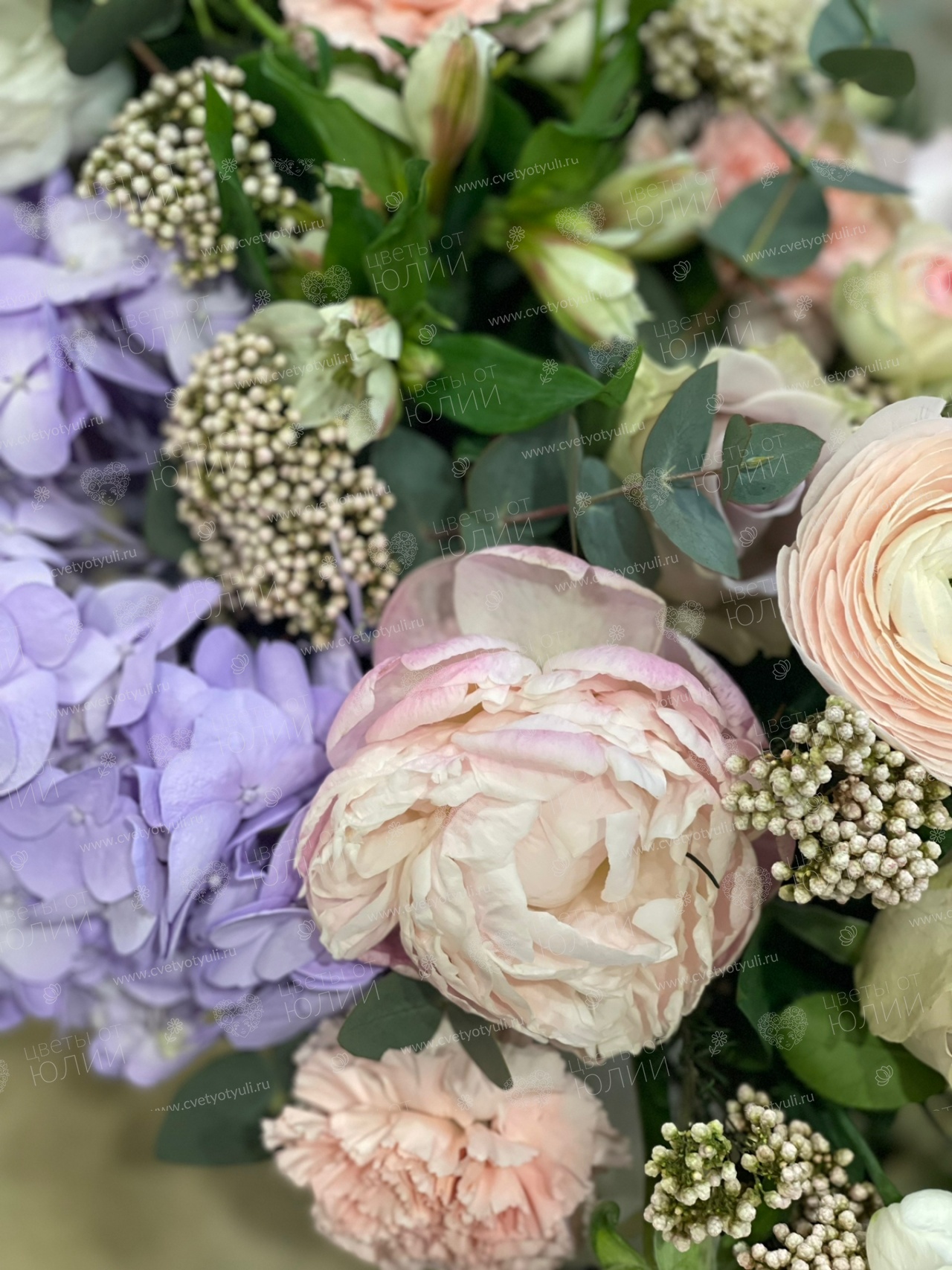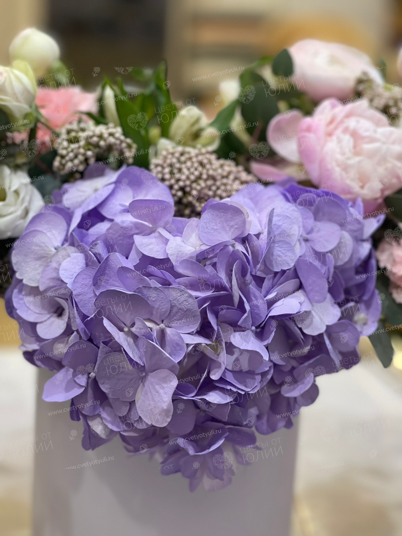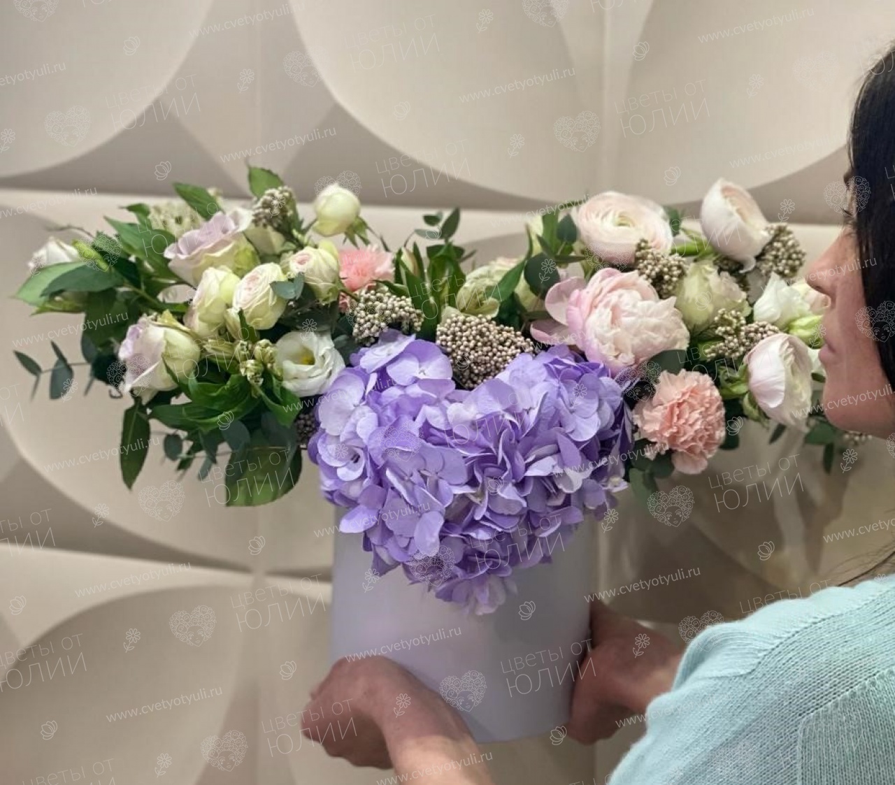 Гортензия - 1 шт, озатамус - 1 шт, Роза - 7 шт, пион - 1 шт, ранункулюс - 3 шт, альстромерия - 3 шт, диантус - 3 шт, лизиантус - 2 шт, роза кустовая - 2 шт, эвкалипт, биофлора, шляпная коробка