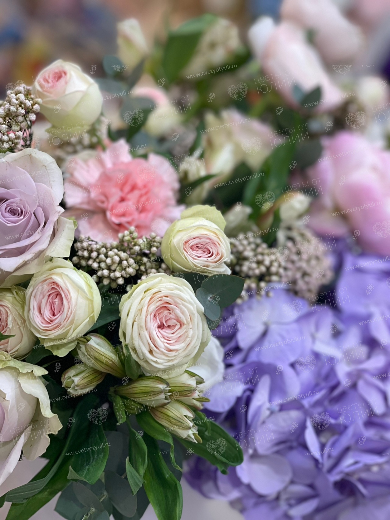 • Состав: Гортензии, Розы, Альстромерии, Орхидеи, Пионы, Упаковка, Зелень