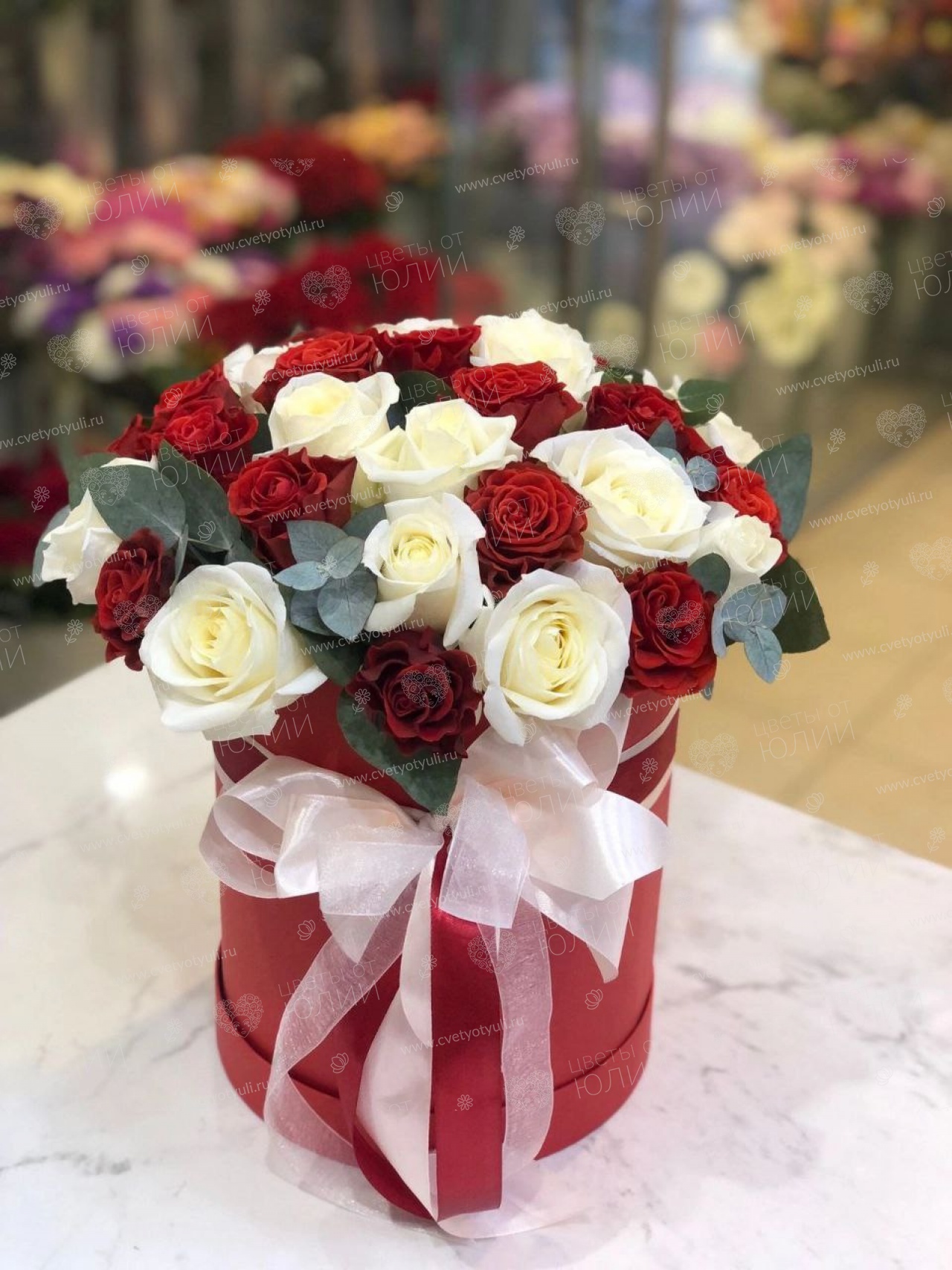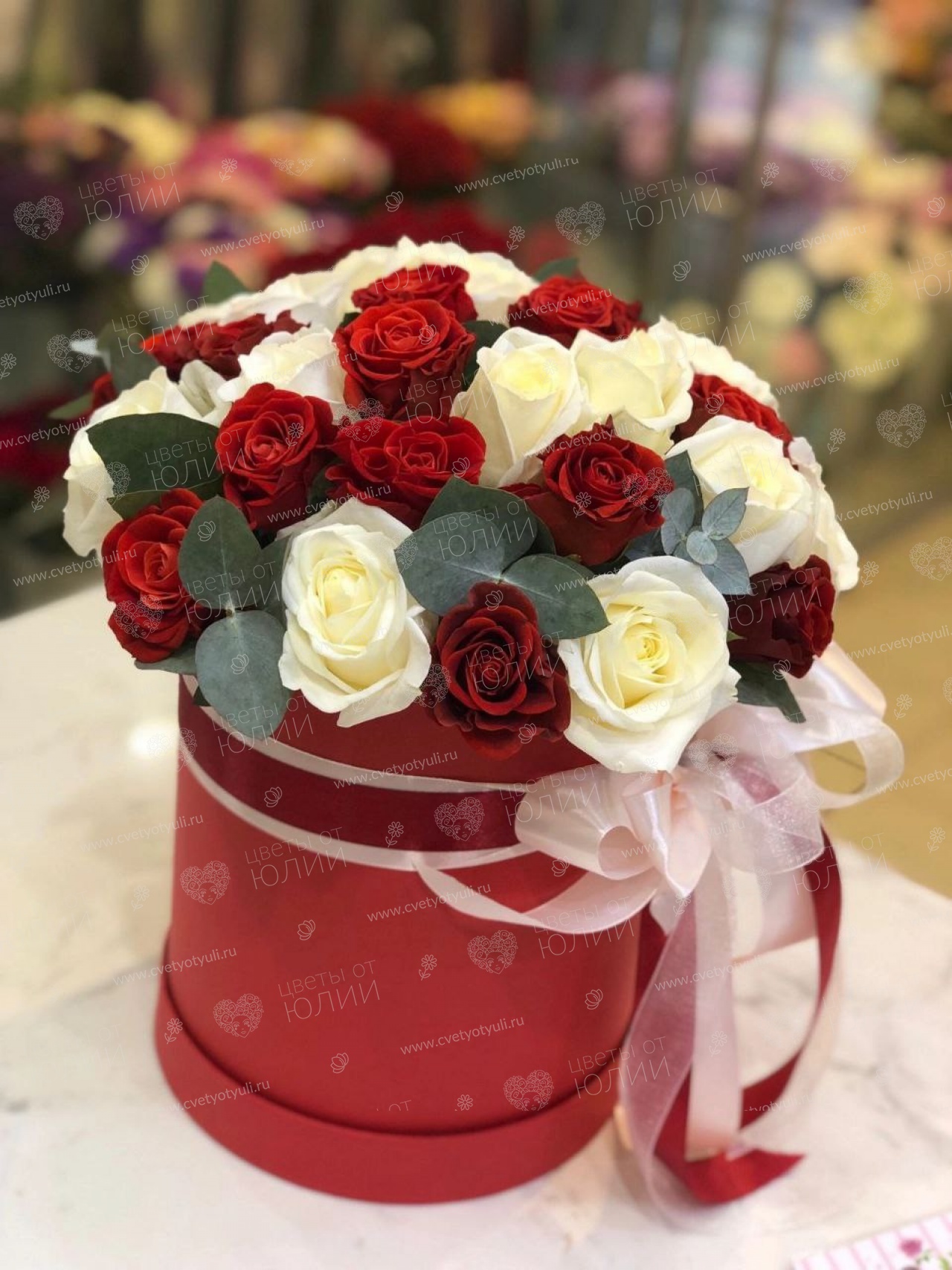 Роза - 31 шт, эвкалипт, фетр, шляпная коробка.
