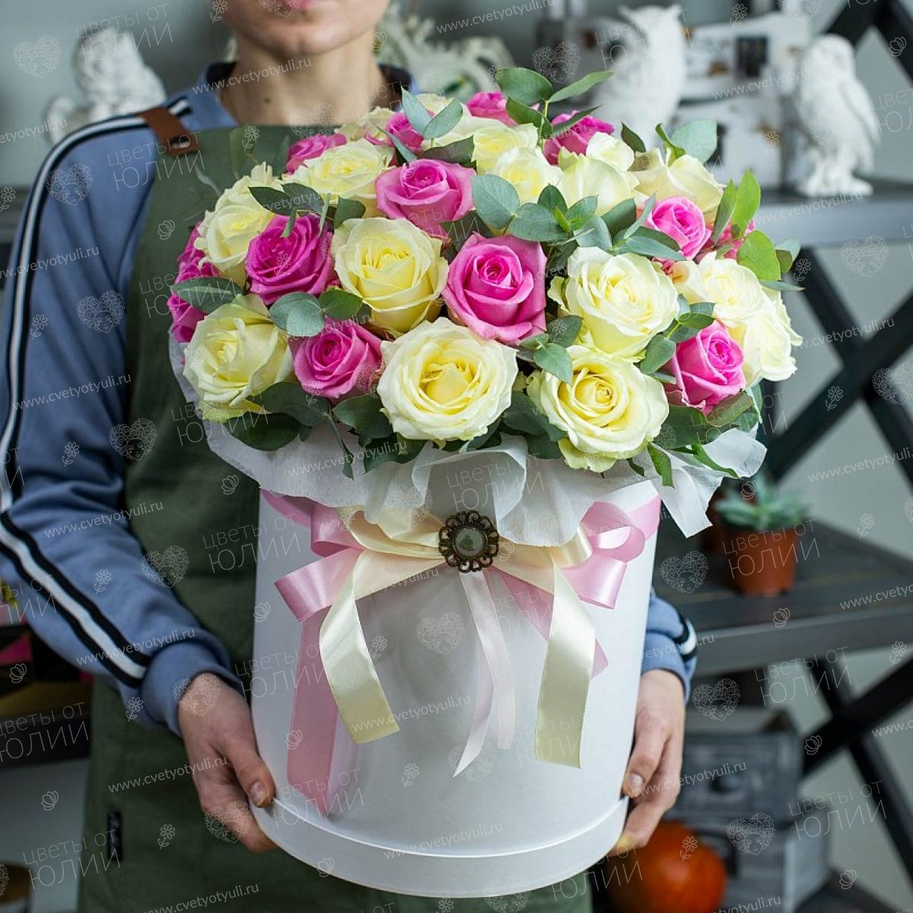 Роза - 31 шт, эвкалипт, фетр, шляпная коробка.