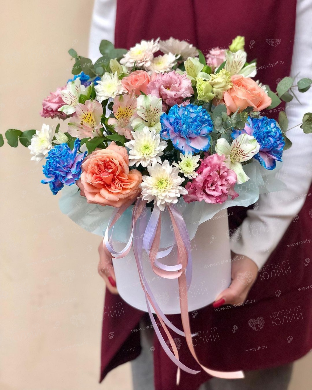 Роза 40 см - 3 шт, гвоздика - 5 шт, хрихантема кустовая - 2шт, альстромерия - 4 шт, эустома - 2 шт, эвкалипт, шляпная коробка, фетр, лента.