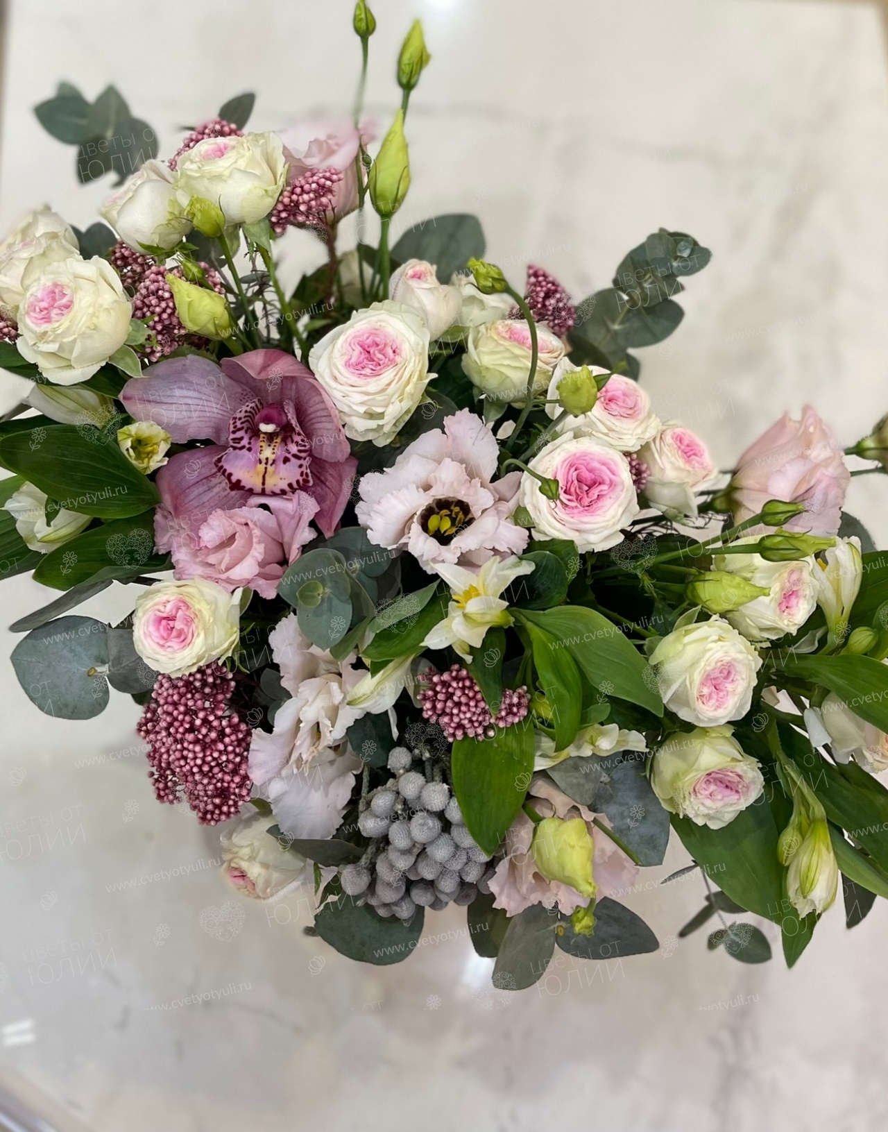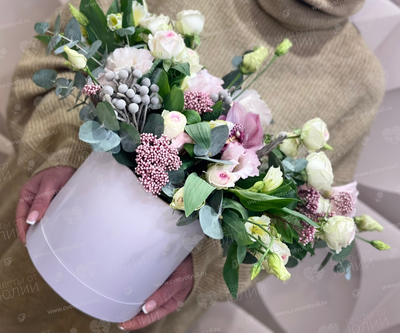Лизиантус - 2, роза кустовая - 2 шт, орхидея - 1 шт, альстромерия - 3 шт, бруния - 1 шт, озатамус - 1 шт, эвкалипт, шляпная коробка, биофлора
