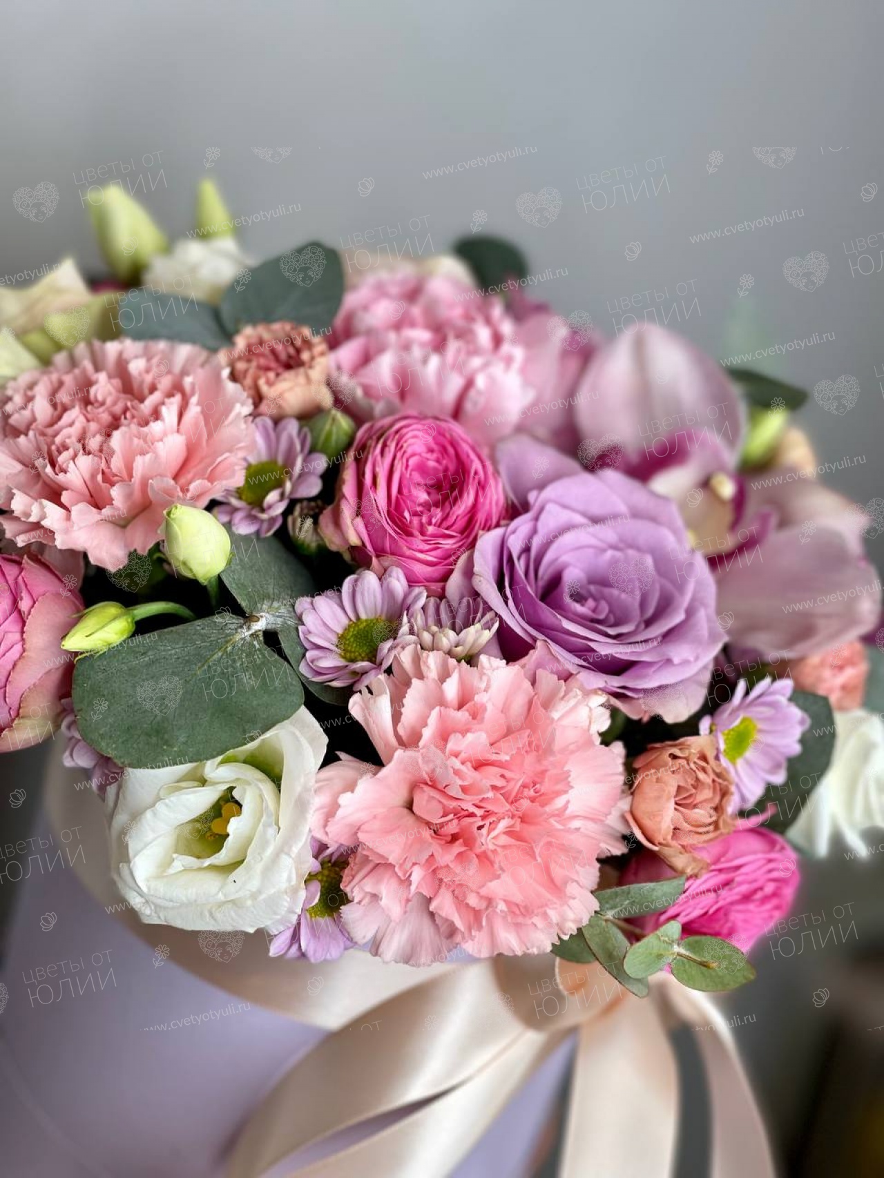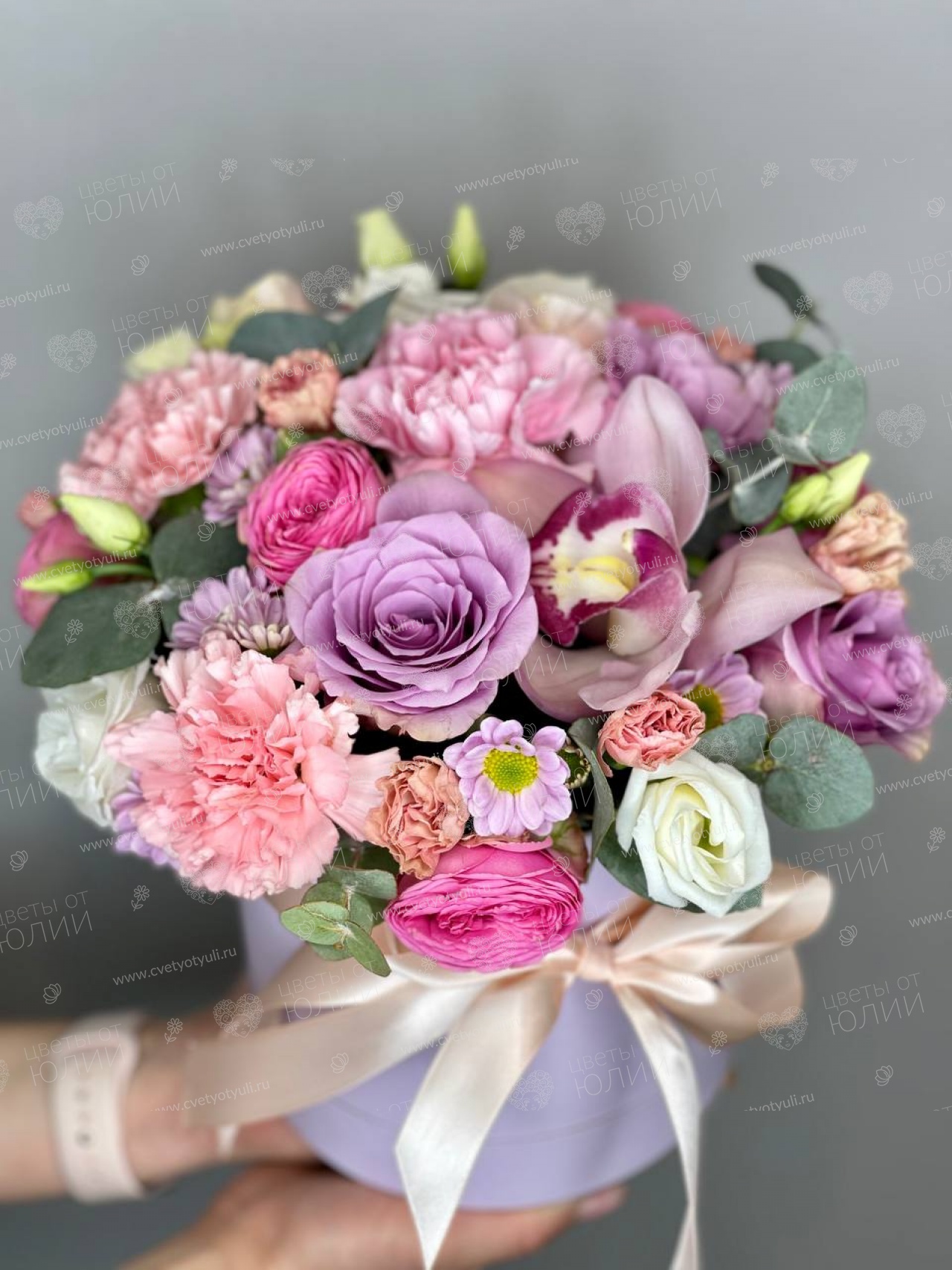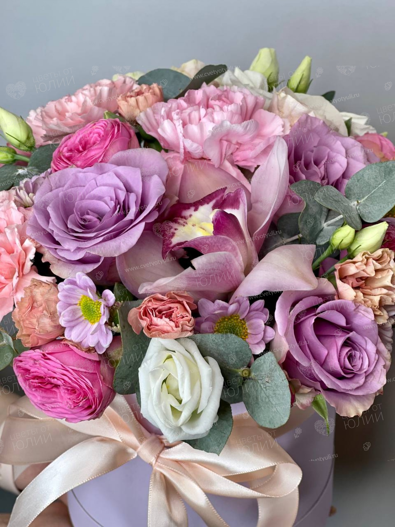 Роза 40 см - 5 шт, лизиантус - 1 шт, орхидея - 1 шт, гвоздика - 3 шт, гвоздика кустовая - 3 шт, Хризантема кустовая сантини - 1 шт, роза кустовая - 1 шт, эвкалипт, биофлора, атласная лента, шляпная коробка.