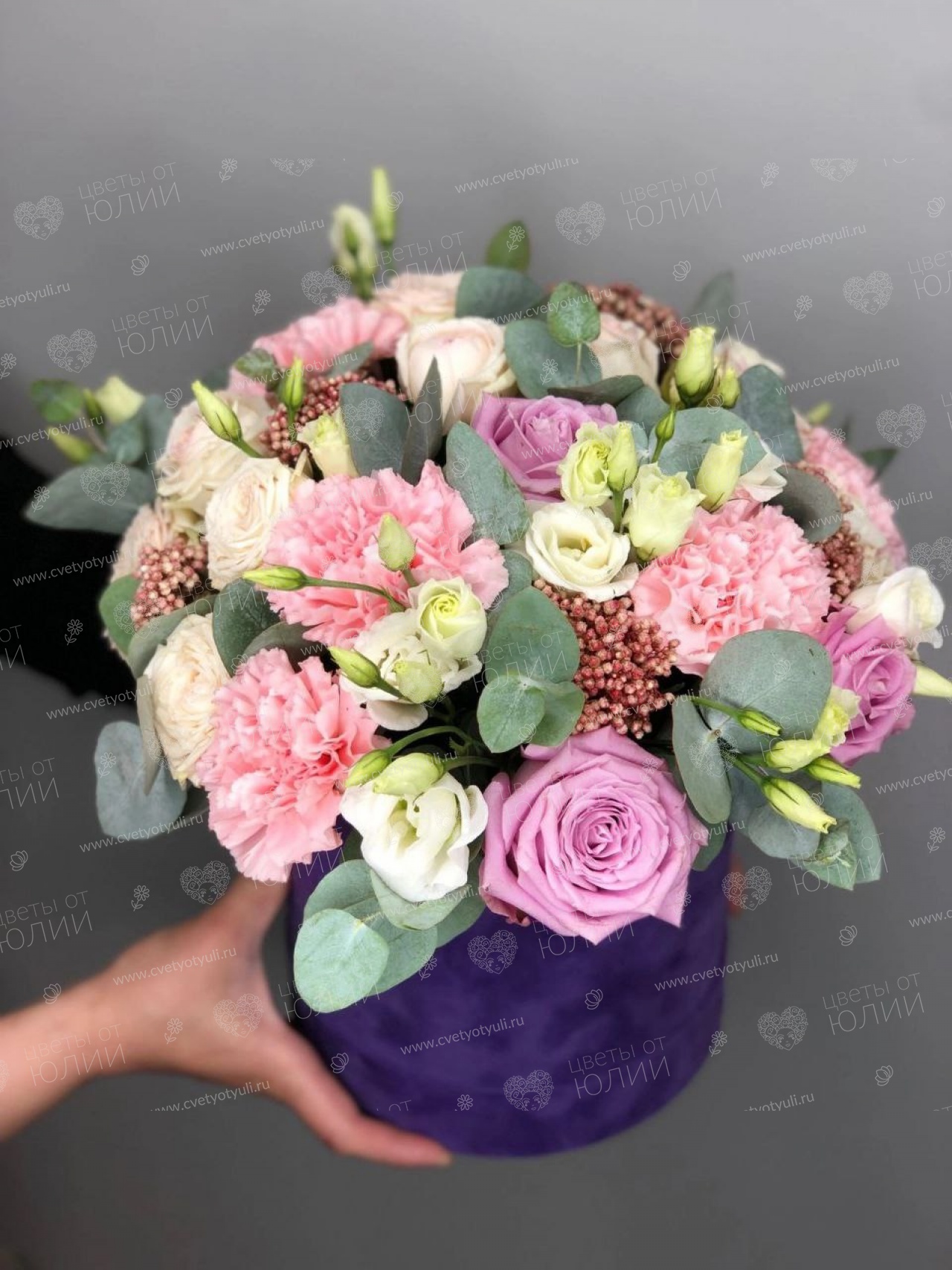 Роза 50 см - 5 шт, роза кустовая - 3 шт, гвоздика - 5 шт, эустома - 2 шт, гиперикум - 2 шт, эвкалипт, шляпная коробка.
