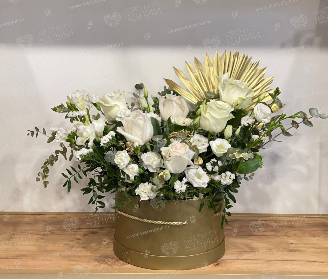 Роза 50 см - 3 шт, Роза пионовидная 40 см - 4 шт, Фрезия - 3 шт, Станица - 2 шт , Эустома - 3 шт, Озотамнус - 2 шт, Бруния - 1 шт, Эвкалипт - 1 шт, Лист пальмы - 1 шт, Гвоздика кустовая - 4 шт, Писташ - 4 шт