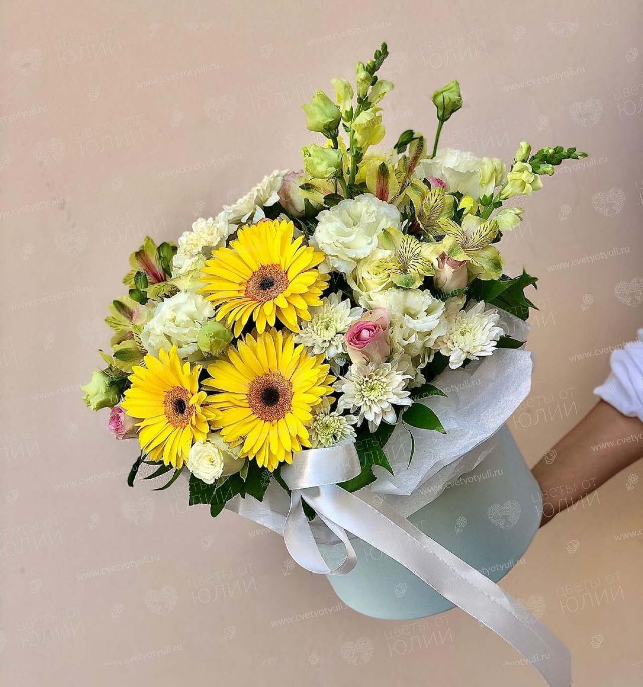 Гербера - 3 шт, Хризантема кустовая - 1 шт, эустома - 2 шт, роза кустовая - 1, альстромерия - 4 шт, писташ - 4, фетр, шляпная коробка.