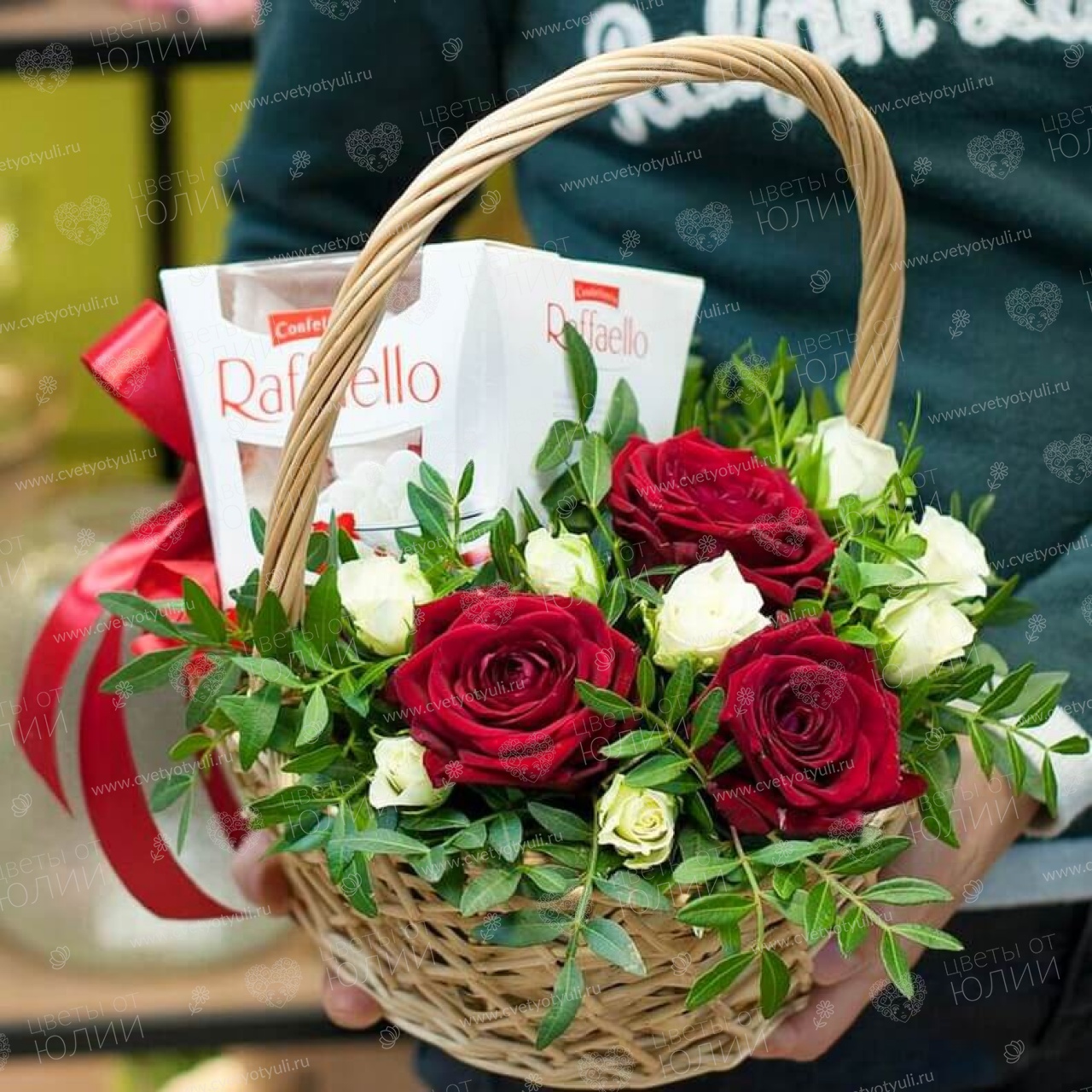Роза - 3 шт, роза спрей -2 шт, писташ - 3 шт, корзинка, конфеты "Raffaello"