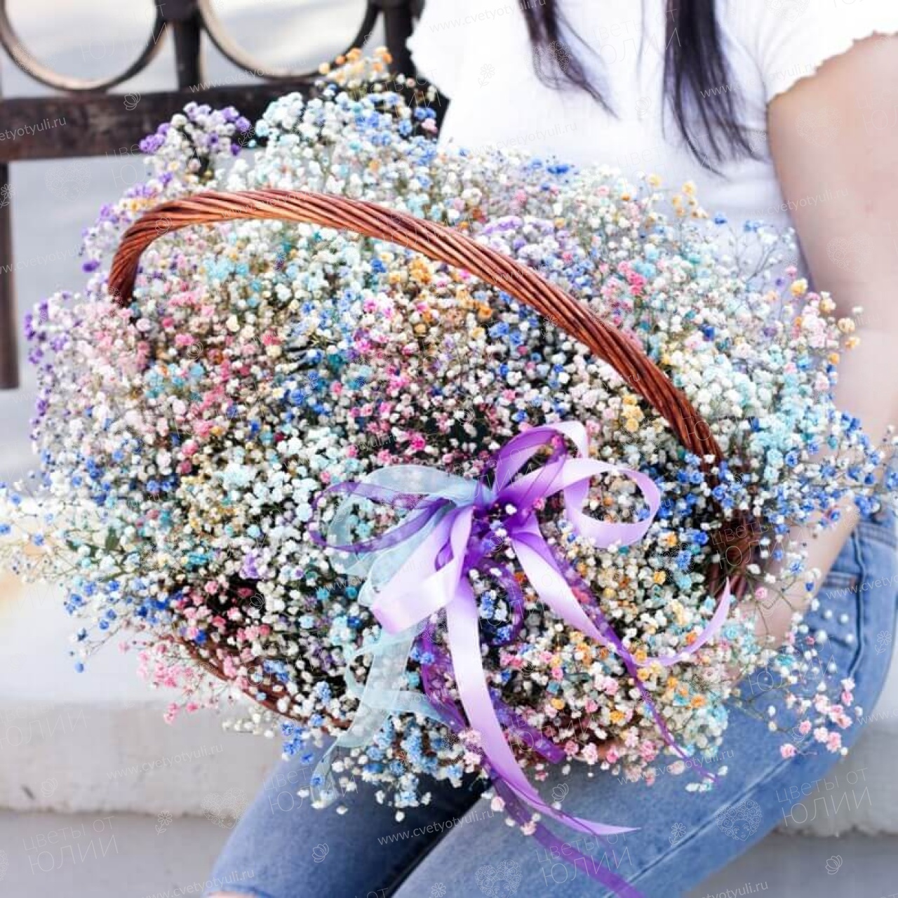 Гипсофила радужная - 21 шт, корзина, лента.