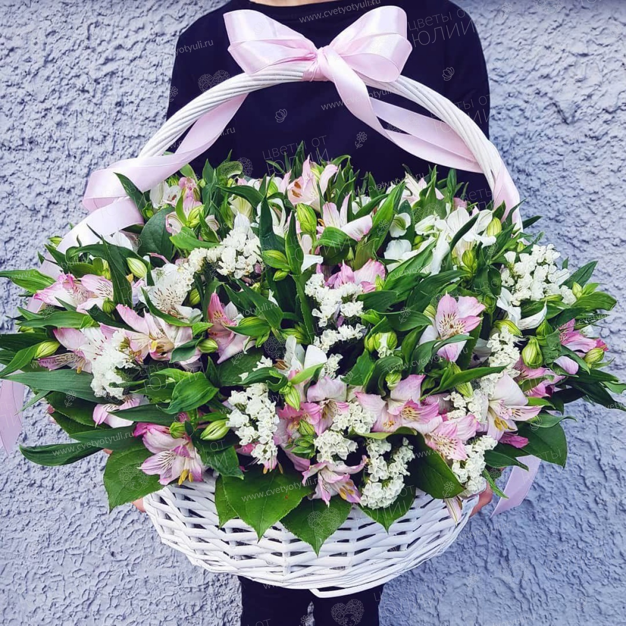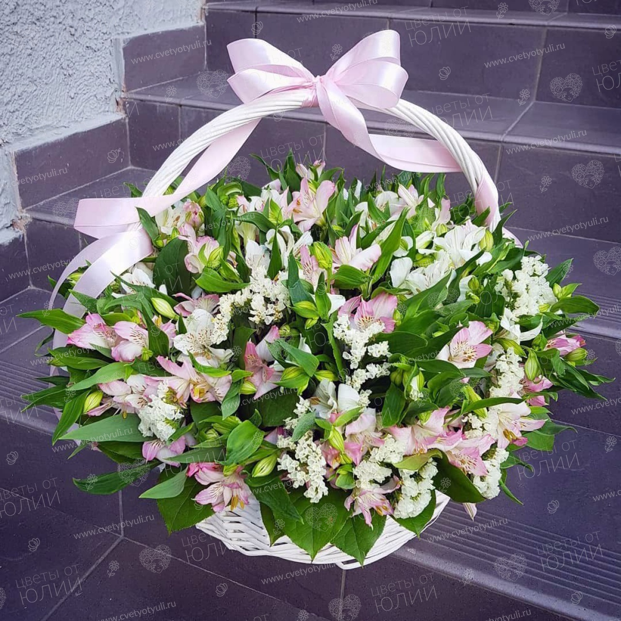 Альстромерия - 21, статица 10 шт, салал, корзина, лента.