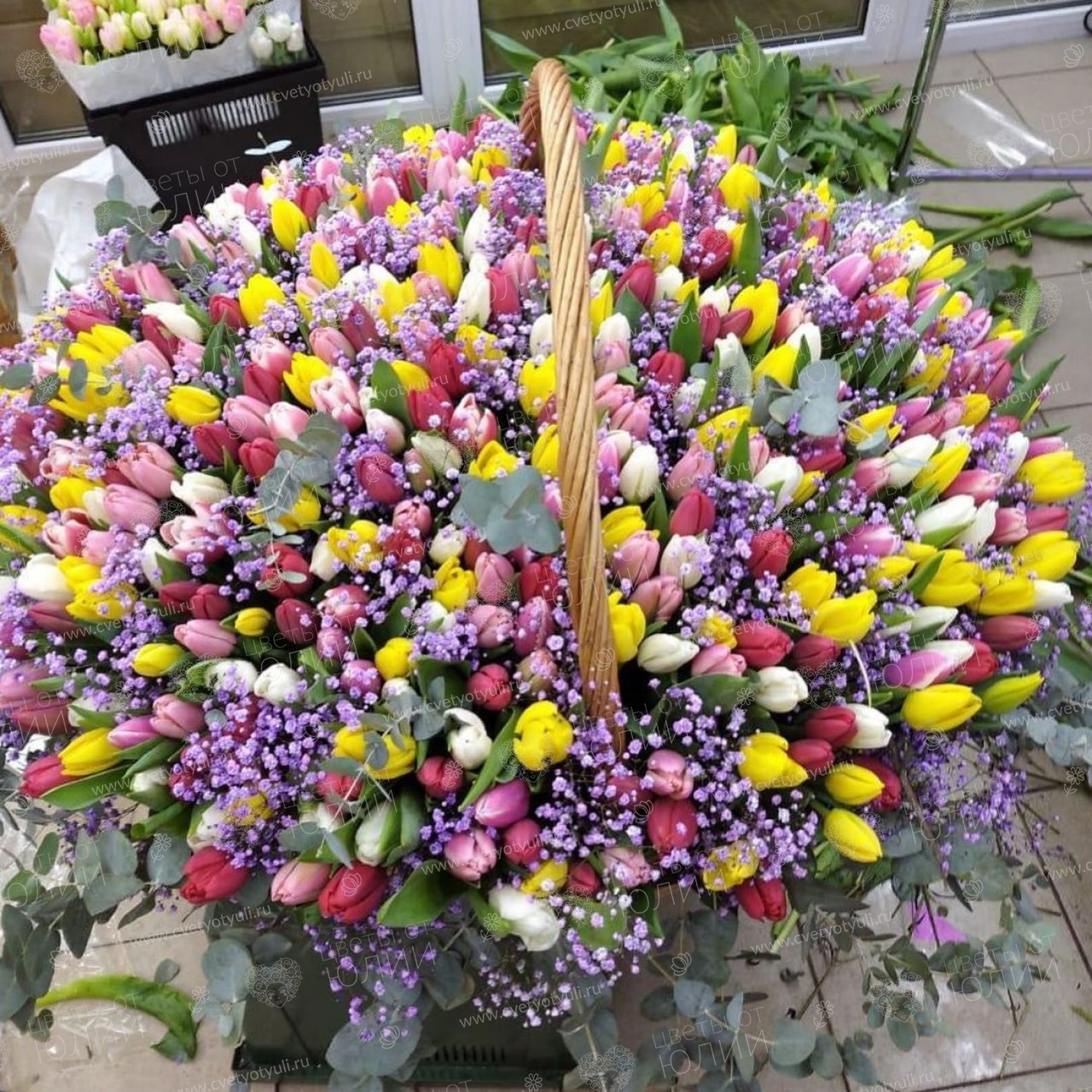Тюльпан - 301 шт, гипсофила радужная - 10 шт, эвкалипт, корзина.